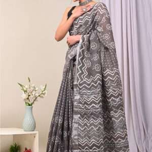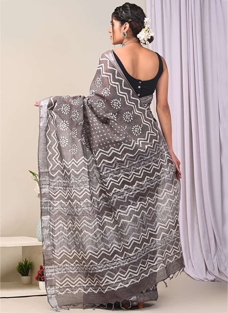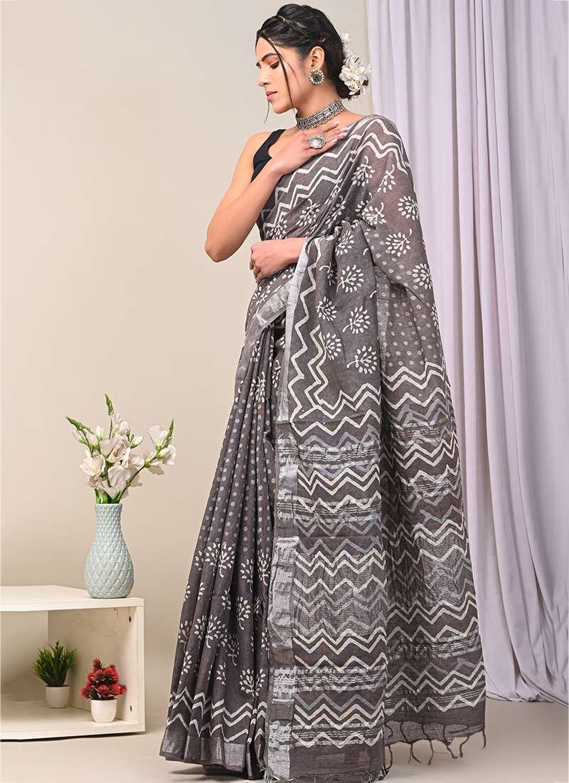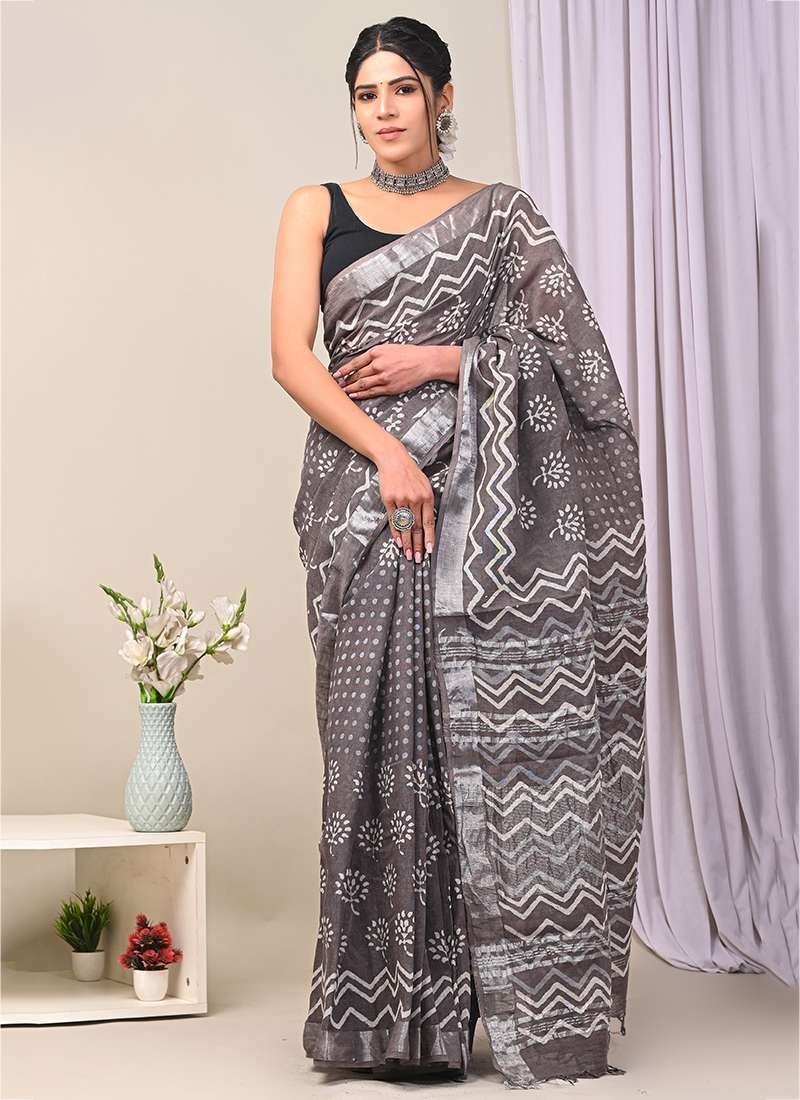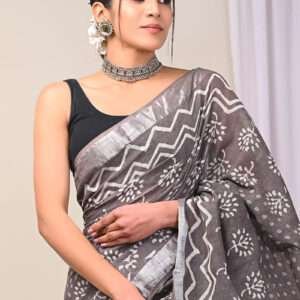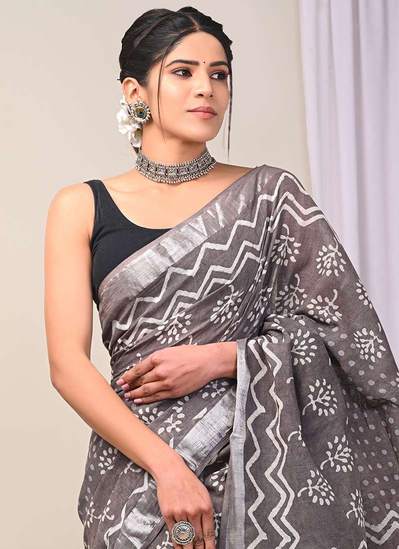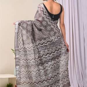 Indulge in the exquisite charm of our Grey Linen Cotton Casual Wear Bagru Prited Saree. Crafted from the finest linen and cotton, this stunning saree exudes effortless elegance. The intricate Bagru print, an ancient technique that uses natural dyes, adorns the fabric with vibrant patterns, creating a captivating visual masterpiece. Its lightweight and breathable design ensures comfort all day long, making it the perfect choice for casual gatherings. With its versatile hue and stunning motifs, this saree is a timeless piece that will elevate your style and turn heads wherever you go. Note that the length may vary slightly, and a professional dry clean is recommended for the first wash to preserve its pristine condition.
