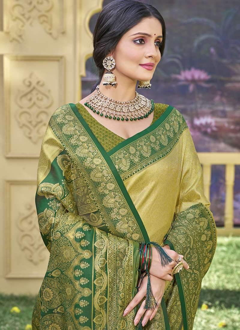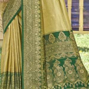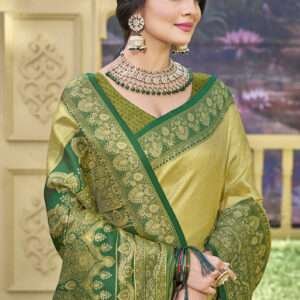 Immerse yourself in the resplendent beauty of our Banarasi Silk Green Ceremonial Wear Weaving Saree. Handcrafted from the finest banarasi silk, this exquisite saree showcases intricate weaving that elevates its ceremonial elegance. The captivating green hue exudes sophistication and grace, making it a perfect choice for auspicious occasions. Its luxurious fabric flows effortlessly, enhancing your every move with unparalleled comfort. The saree’s vibrant hues and intricate details make it a timeless masterpiece that will be cherished for years to come. Whether attending a wedding, a grand celebration, or a formal gathering, this Banarasi silk saree will make you the epitome of style and grace.