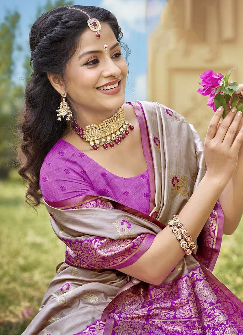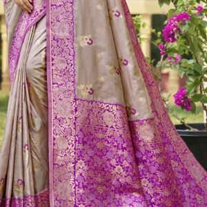 Indulge in the regal elegance of our Banarasi Silk Grey Ceremonial Wear Weaving Saree. Handcrafted from exquisite banarasi silk, this masterpiece boasts an intricate weaving pattern that adds a touch of opulent charm to your attire. The vibrant grey hue exudes sophistication and grace, making it perfect for any special occasion. This exquisite saree is meticulously woven, showcasing the artistry and heritage of Indian textiles. Drape yourself in its luxurious embrace and feel the weight of tradition and style. Note: Dry clean for first wash to preserve its delicate beauty. Embrace the timeless charm of Banarasi silk with our Ceremonial Wear Weaving Saree.