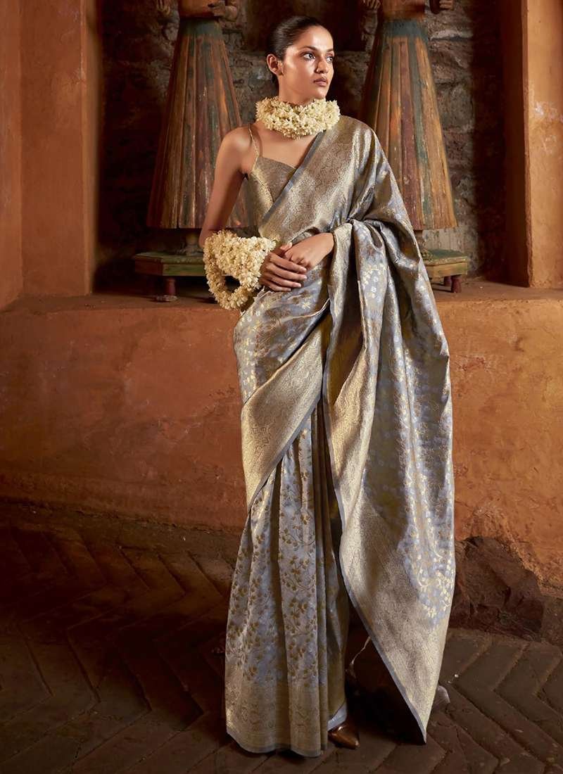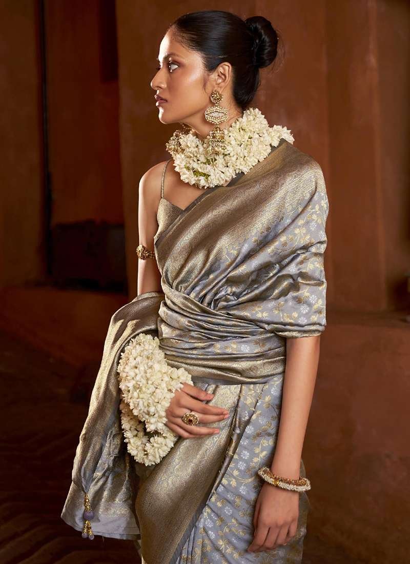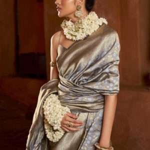 Embrace the epitome of elegance with our exquisite Banarasi Silk Grey Traditional Wear Weaving Saree. Crafted from the finest banarasi silk, this stunning saree exudes a timeless charm. The intricate weaving adorning the fabric adds a touch of opulence, making it a perfect choice for special occasions. Its rich grey hue exudes sophistication and versatility, seamlessly complementing any skin tone. The fabric’s delicate sheen and smooth drape ensure a graceful silhouette, allowing you to move with confidence and poise. This saree is a true masterpiece, destined to turn heads and create lasting memories. Note: first wash dry clean. Please note that accessories shown in the image are for presentation purposes only and length may vary up to 2 inches. There may be a slight variation in actual color versus the image due to screen resolution.
