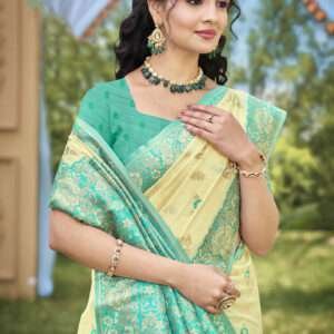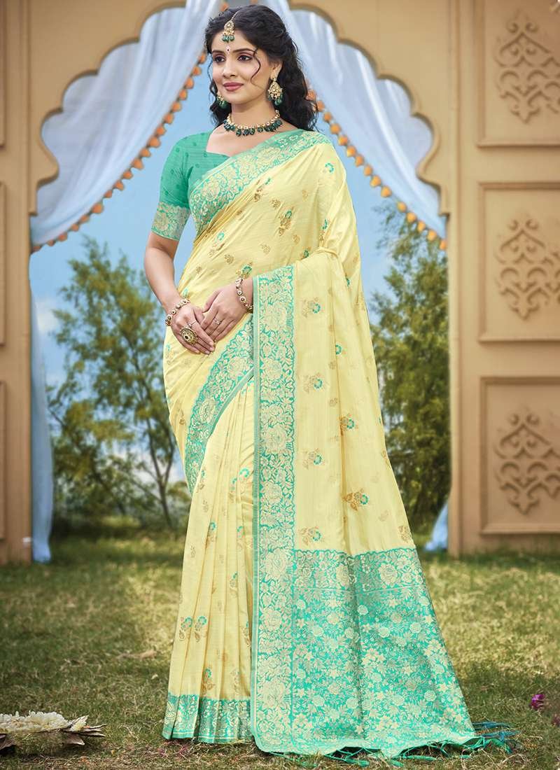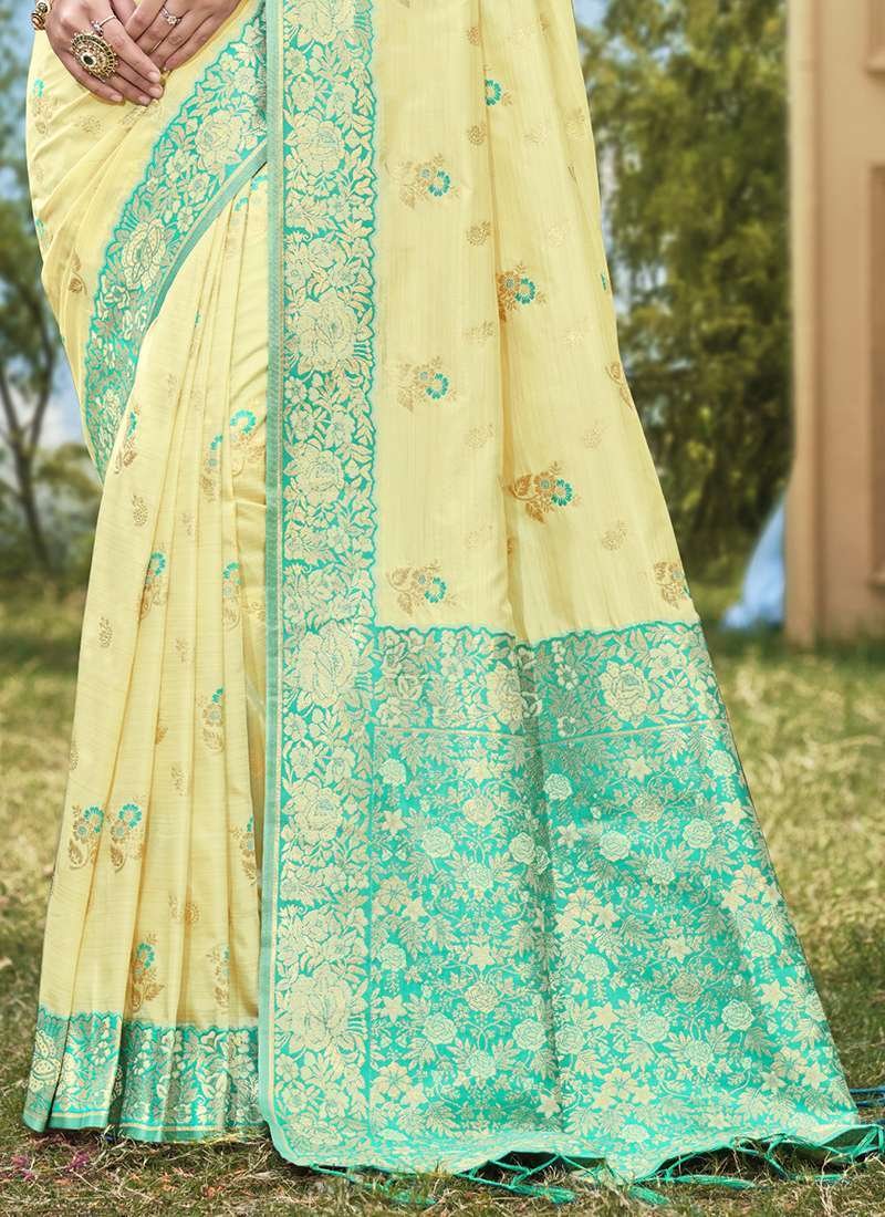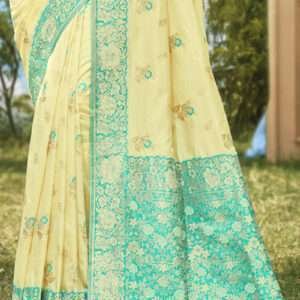 Indulge in the exquisite elegance of our Banarasi Silk Light Yellow Ceremonial Wear Weaving Saree, a testament to the rich heritage of Indian textiles. Crafted from ethereal banarasi silk, this saree transcends time, evoking the grandeur of traditional Indian ceremonies. Its captivating light yellow hue emanates a serene glow, while the intricate weaving adorning it is a masterpiece of craftsmanship. Whether it’s a wedding, an anniversary, or any other significant occasion, this saree will elevate your presence, making you a radiant embodiment of grace and sophistication. Note: Accessories and length may vary. Dry cleaning is recommended for the first wash to preserve its pristine beauty.