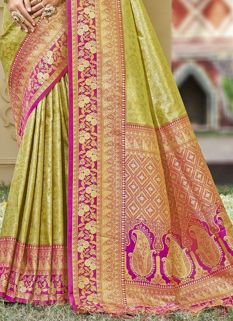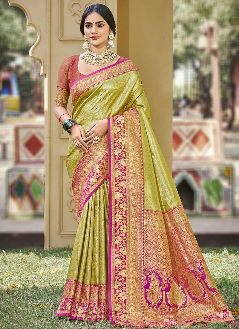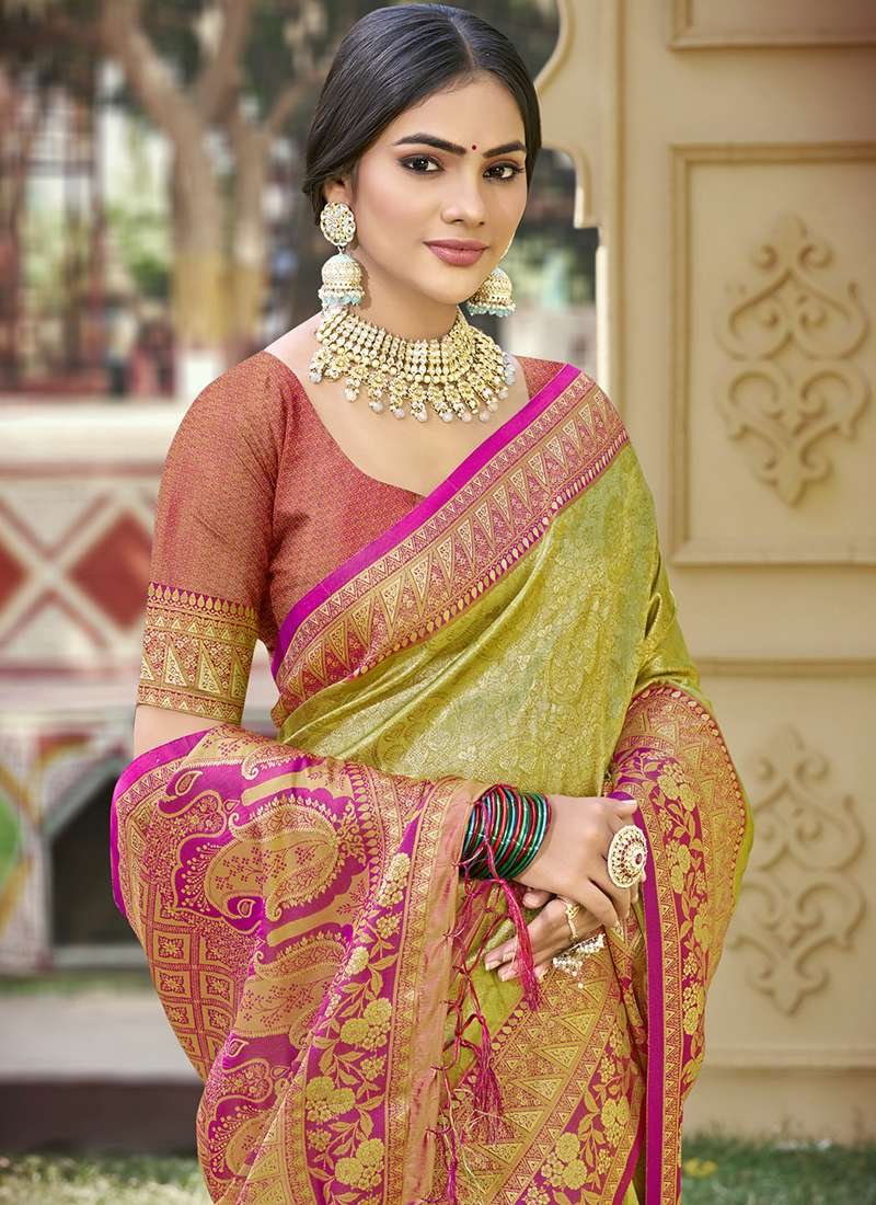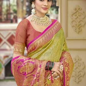 Embrace the grandeur of tradition with our exquisite Banarasi Silk Mehendi Ceremonial Wear Weaving Saree. Crafted from the finest Banarasi silk, this ethereal masterpiece is adorned with intricate weaving patterns that evoke the rich cultural heritage of India. Its vibrant Mehendi hue captivates the senses, making it the perfect attire for any celebratory occasion. The saree’s delicate craftsmanship and luxurious fabric exude elegance and grace, ensuring you make a captivating entrance. Note that the accessories depicted in the product image are solely for display purposes, and the actual length may vary slightly. Dry cleaning is recommended for the first wash to preserve the saree’s pristine condition.