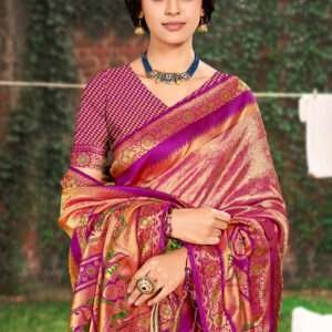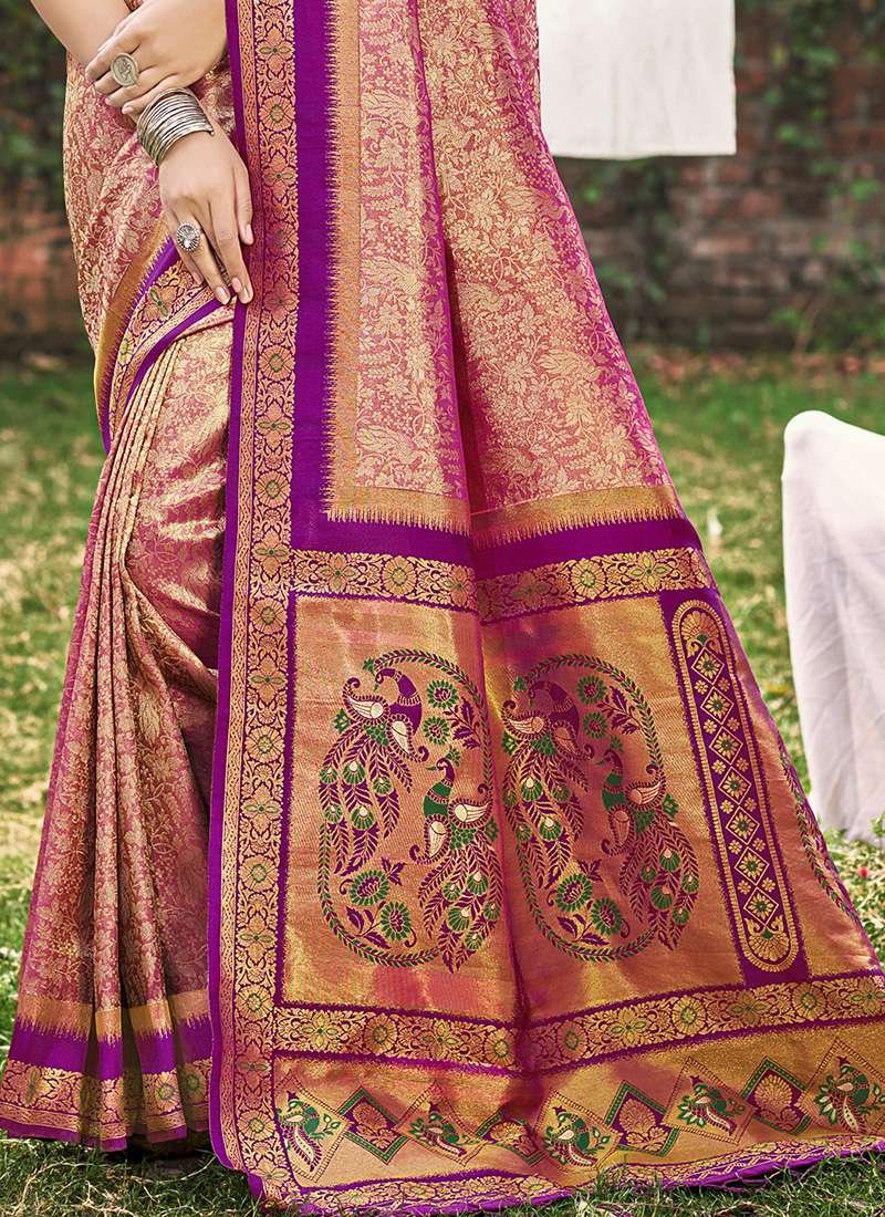 Embrace elegance in our stunning Banarasi Silk Peach Ceremonial Wear Weaving Saree. Crafted from luxurious Banarasi silk, this exquisite saree features intricate weaving that adds a touch of grandeur to your special occasions. Its peach hue exudes warmth and vibrance, making it perfect for weddings, festivals, and other ceremonial events. First wash requires dry cleaning. Do note that accessories in the image are for presentation purposes only, and the length may vary slightly. Immerse yourself in the timeless beauty and opulence of this Banarasi silk masterpiece.