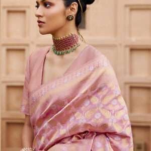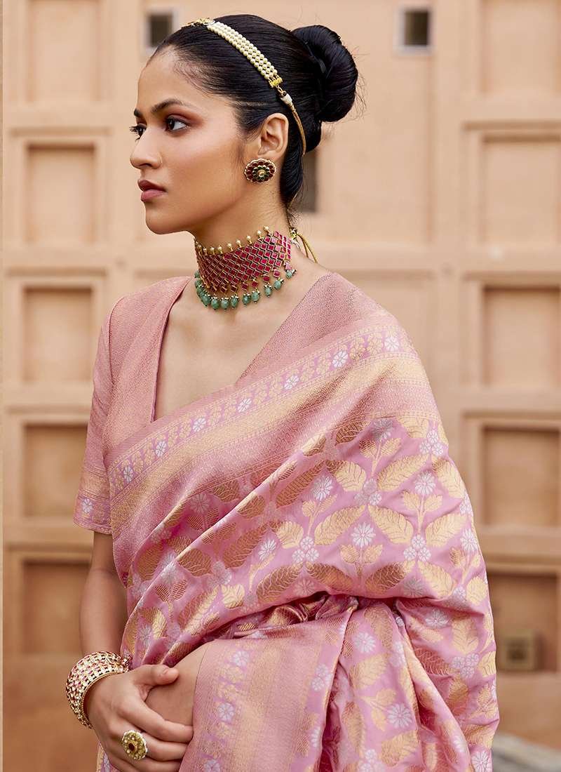 Immerse yourself in the ethereal beauty of our Banarasi Silk Pink Festival Wear Jaal Work Saree, a sartorial masterpiece that embodies the rich cultural heritage of India. Crafted from the finest Banarasi silk, this exquisite drape exudes a soft and luxurious feel against your skin. Its captivating pink hue adds a vibrant touch to your ensemble, making it perfect for celebratory occasions and festivals. The saree is adorned with intricate jaal work, an intricate pattern of interconnected motifs that lends it an air of timeless elegance. Pair it with traditional jewelry and a stylish blouse for a look that radiates grace and sophistication. Note that accessories shown in the image are for presentation purposes only, and the actual length may vary by up to 2 inches. Slight variations in color are possible due to differences in screen settings. Indulge in the allure of this exquisite Banarasi silk saree and create unforgettable memories at your next special event.