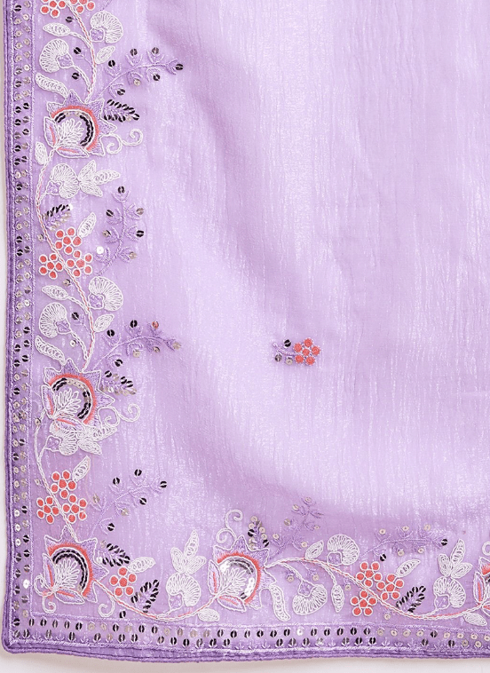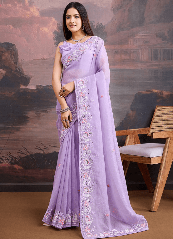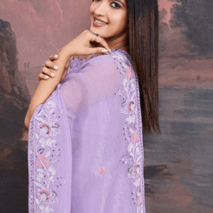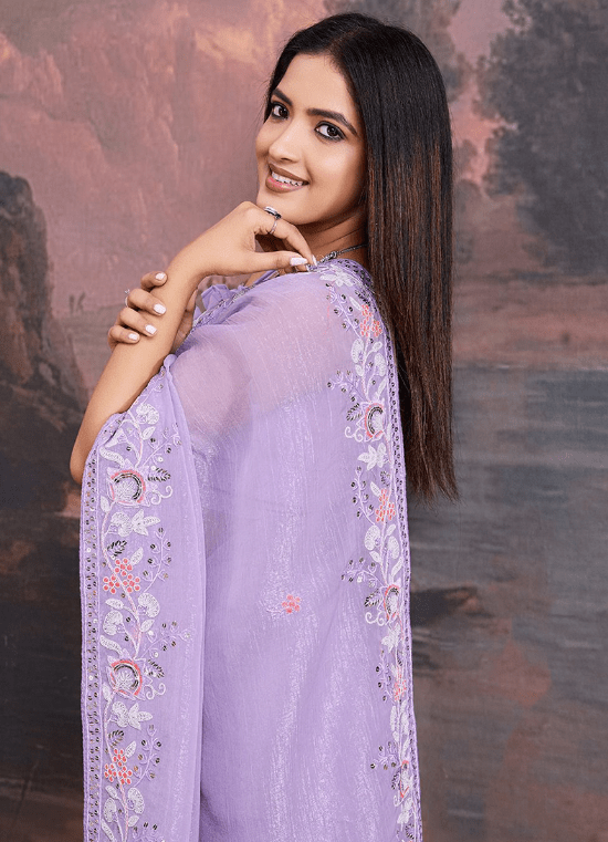 Immerse yourself in the ethereal beauty of our Crunchy Organza Lavender Traditional Wear Embroidery Work Saree. This exquisite attire captivates all who behold it with its delicate lavender hue and intricate embroidery work. Crafted from the finest crunchy organza fabric, our saree exudes an ethereal elegance that will turn heads wherever you go. The intricate embroidery adorning its length adds a touch of traditional splendor, making it perfect for special occasions and festive gatherings. Immerse yourself in the allure of our lavender organza saree, a testament to timeless grace and modern aesthetics.