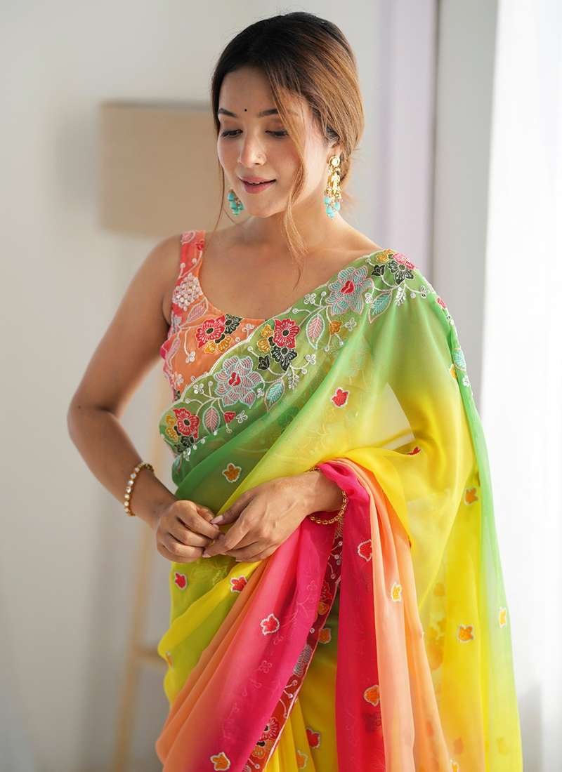 Immerse yourself in elegance and grace with our stunning Georgette Multi Party Wear Embroidery Work Saree. Crafted from ethereal georgette fabric, this exquisite drape features a vibrant multi-hued palette that exudes sophistication. Each saree is meticulously adorned with intricate embroidery work, showcasing a symphony of colors and patterns that dance upon the fabric. The pallu and border are lavishly embellished, creating a breathtaking visual masterpiece. This party wear saree is the perfect attire for those special occasions where you want to make a lasting impression. Its versatile style makes it suitable for both traditional and contemporary events. Elevate your wardrobe with this timeless treasure and let your radiance shine through.