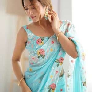 Unveil the epitome of elegance with our exquisite Georgette Sky Blue Party Wear Embroidery Work Saree. Crafted from the finest Georgette fabric, this ethereal drape cascades down your silhouette with a symphony of vibrant sky blue. Intricate embroidery work adorns the saree, painting a canvas of captivating patterns and motifs. With a touch of ethnic allure, this saree is the perfect canvas for the modern woman to express her style and grace at any occasion. The luxurious drape and vibrant hue make it an ideal choice for parties and special events, leaving a lasting impression on all who behold it. Embrace the beauty of traditional artistry and contemporary fashion with our Georgette Sky Blue Party Wear Embroidery Work Saree.