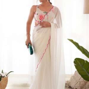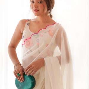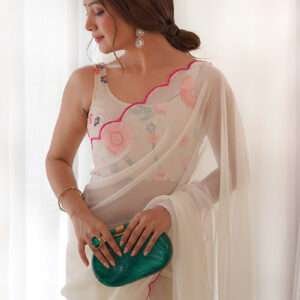 Embrace elegance and sophistication with our exquisite Georgette White Party Wear Embroidery Work Saree. This stunning saree is crafted from ethereal georgette fabric, lending it an air of effortless grace and fluidity. Its pristine white hue radiates a timeless charm, perfect for making a grand entrance at any special occasion. The saree’s highlight is its intricate embroidery work, meticulously rendered to create eye-catching patterns and motifs. From swirling florals to geometric designs, each thread is carefully stitched to enhance the beauty and allure of this piece. Drape this saree effortlessly over your form, and let its ethereal charm captivate all who behold it.