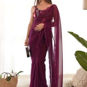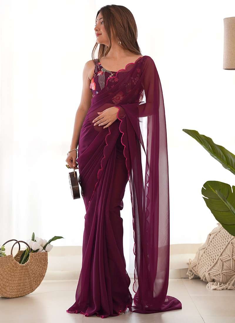 Indulge in the allure of our Georgette Wine Party Wear Embroidery Work Saree, a masterpiece crafted from ethereal georgette fabric. Its sumptuous wine hue exudes elegance and charm, further elevated by the exquisite embroidery work that adorns it. The intricate threadwork adds a touch of opulence and sophistication, transforming this saree into an alluring ensemble perfect for any special occasion. With its graceful drape and flattering silhouette, this saree promises to make you a vision of captivating beauty, leaving an unforgettable mark on every gathering you grace.