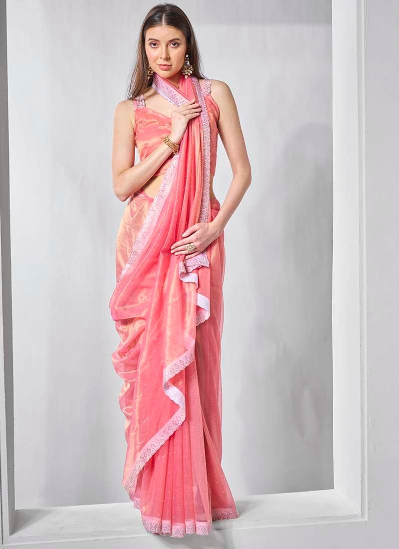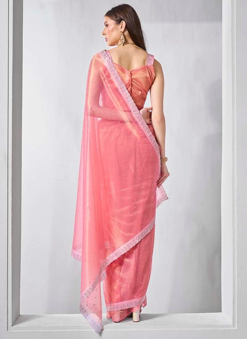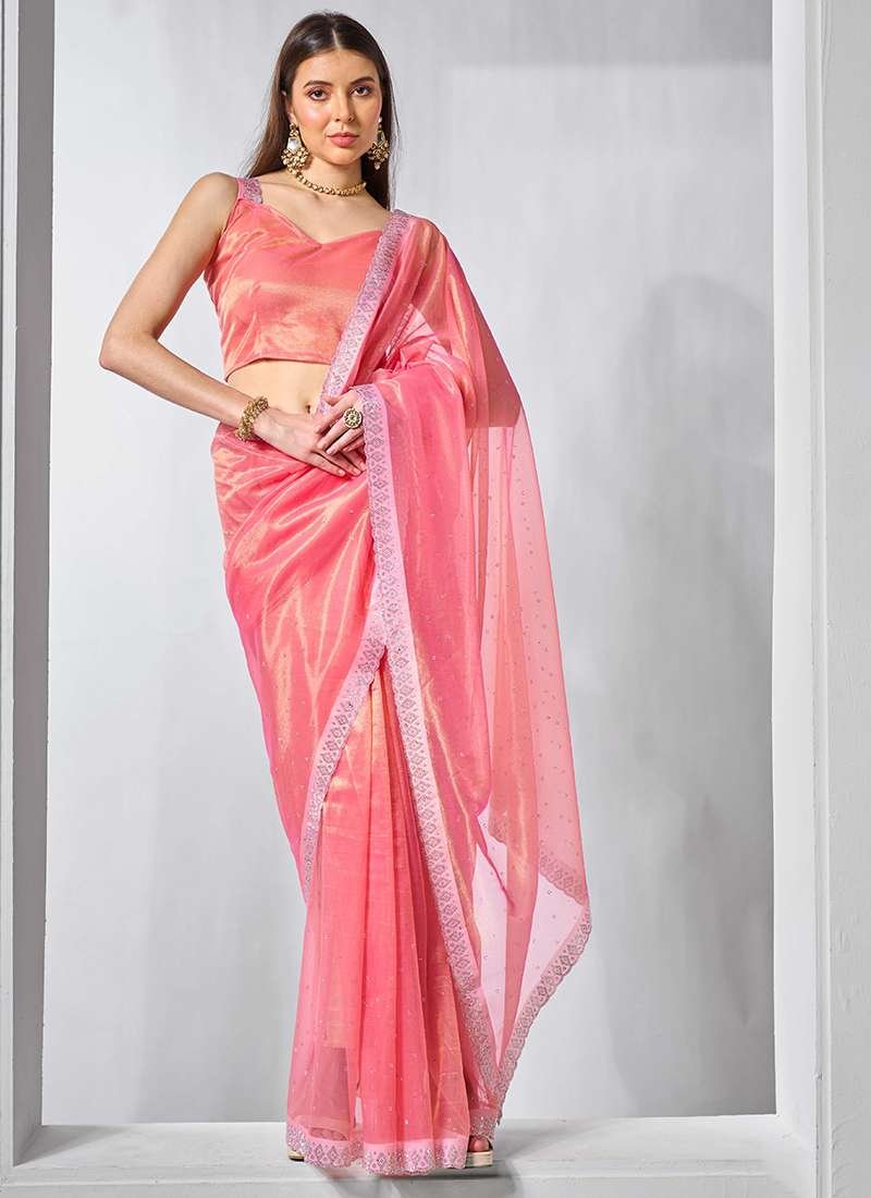 • gold tissue net Sarees In pink