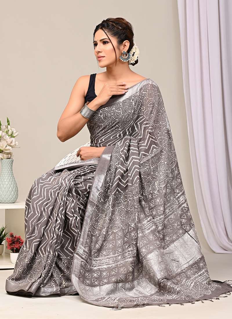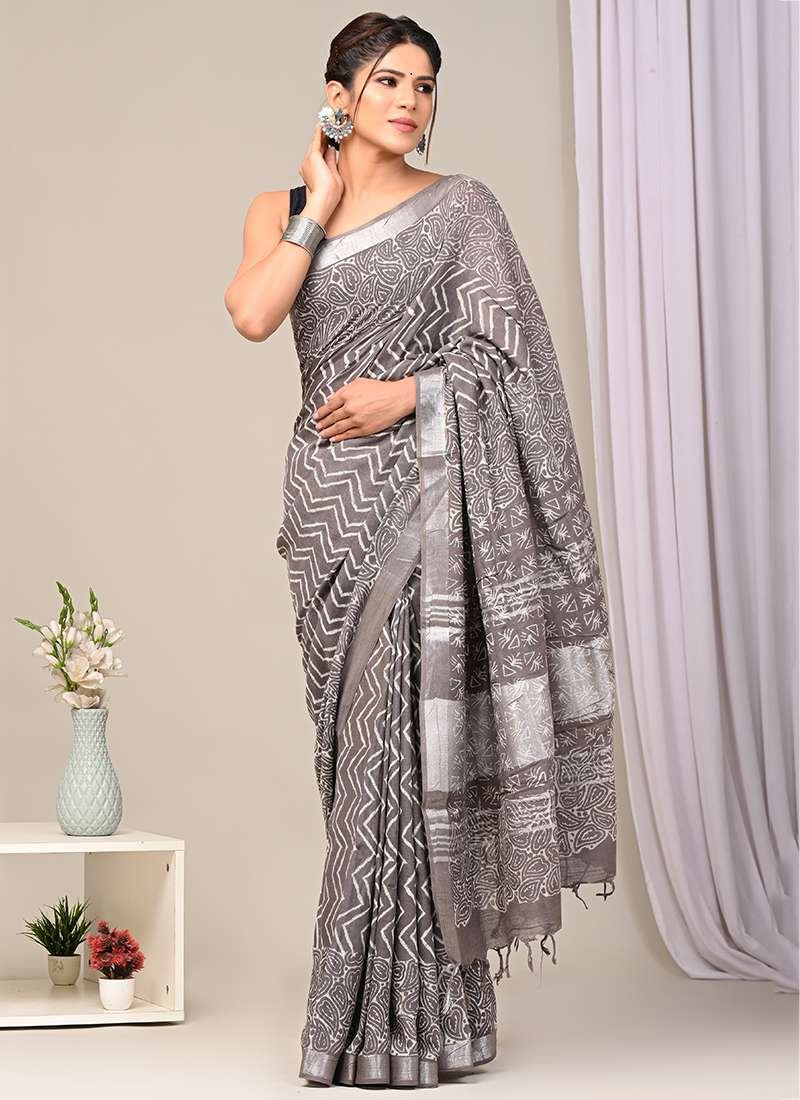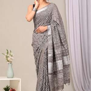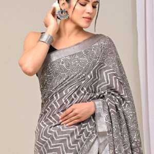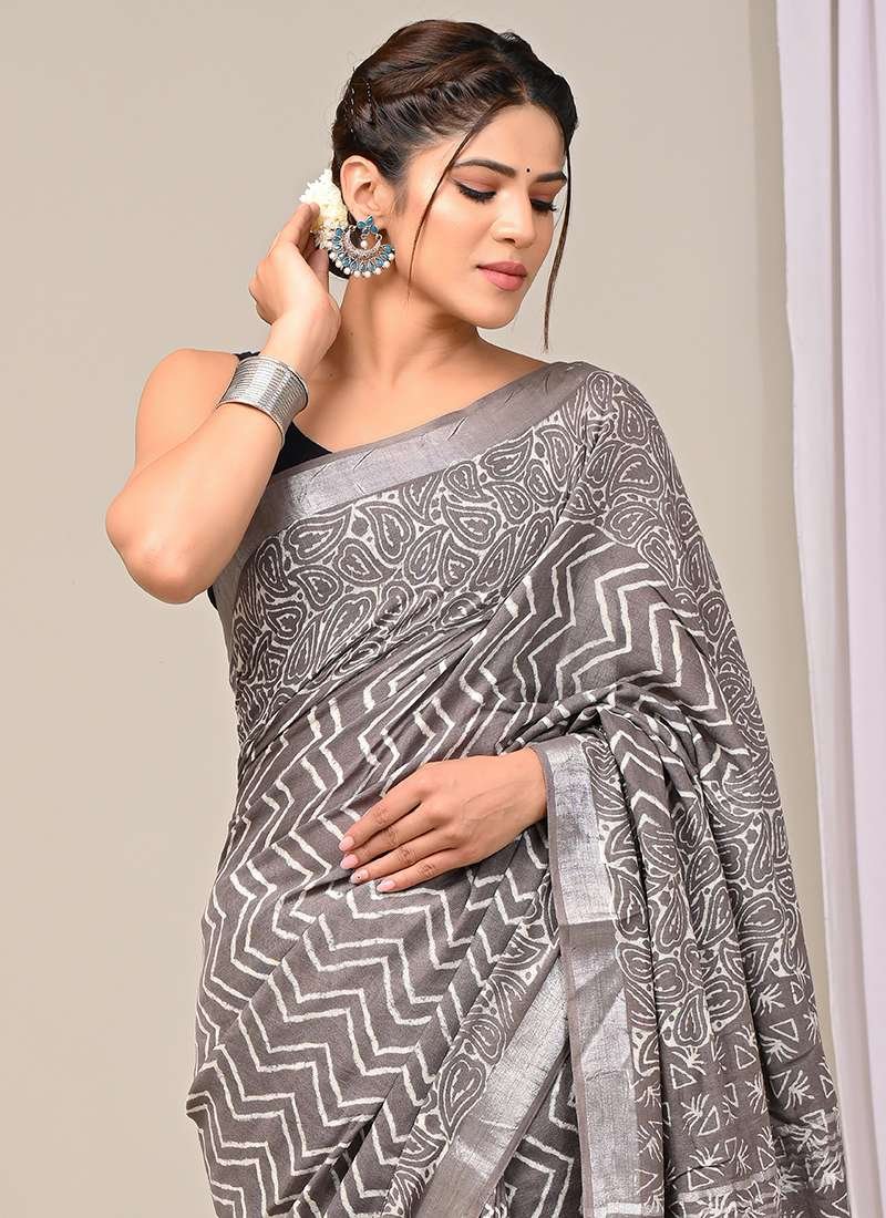 Malhari Grey Linen Cotton Bagru Printed Saree
