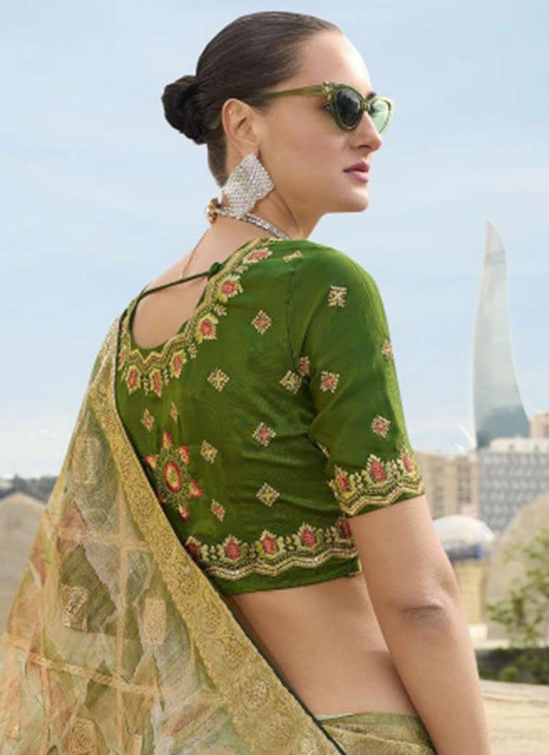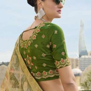 Indulge in the ethereal beauty of the Jacquard Green Ceremonial Wear Swarovski Work Saree, a masterpiece crafted for discerning tastes. This captivating ensemble showcases an exquisite jacquard fabric adorned with intricate Swarovski work, creating a resplendent symphony of light and texture. The vibrant green hue exudes an air of elegance and sophistication, making it an ideal choice for ceremonial occasions. Its intricate detailing with Swarovski crystals adds a touch of timeless glamour, ensuring you turn heads wherever you go. Note that accessories shown in the image are for presentation purposes only, and the length may vary slightly. Dry cleaning is recommended for the first wash to preserve its delicate beauty.