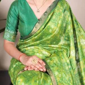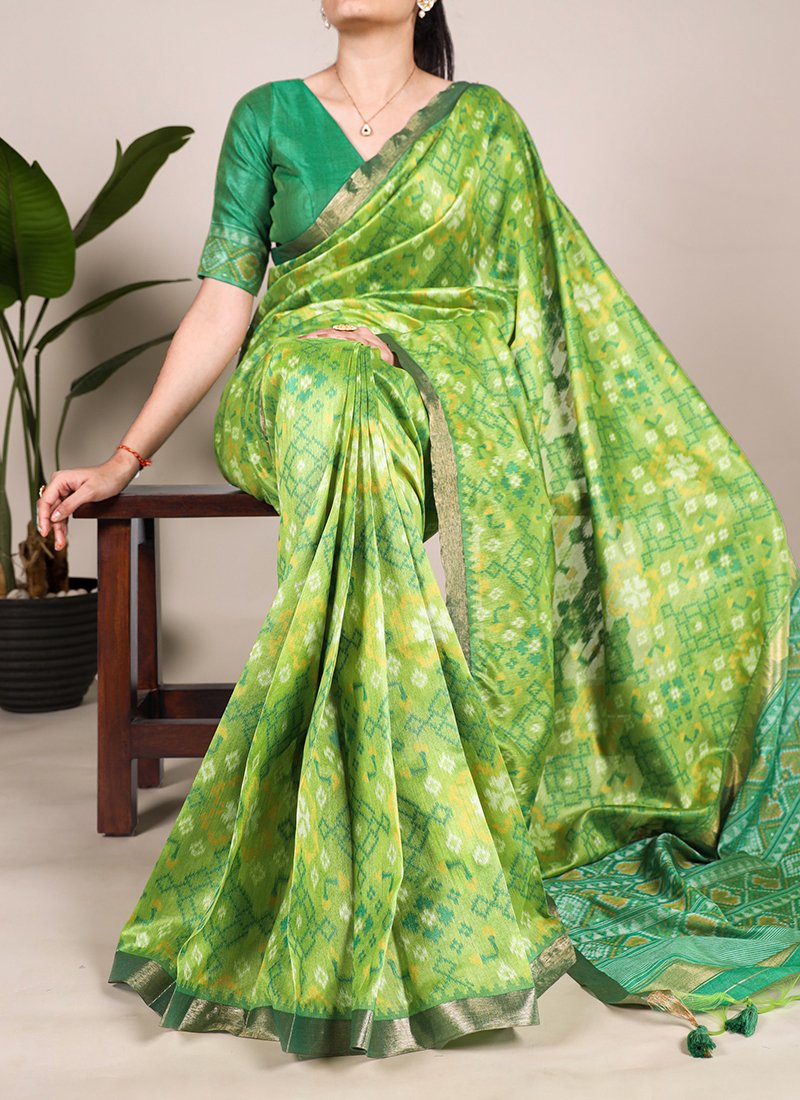 1. Elevate your festive wardrobe with this exquisite Jacquard Silk Saree in a vibrant parrot green hue. The luxurious fabric is adorned with intricate Patola prints, adding a touch of elegance and tradition to your attire.