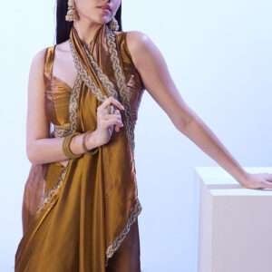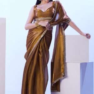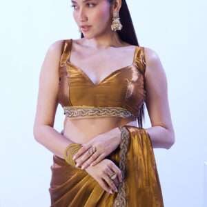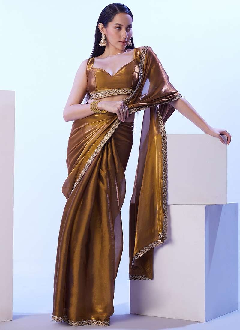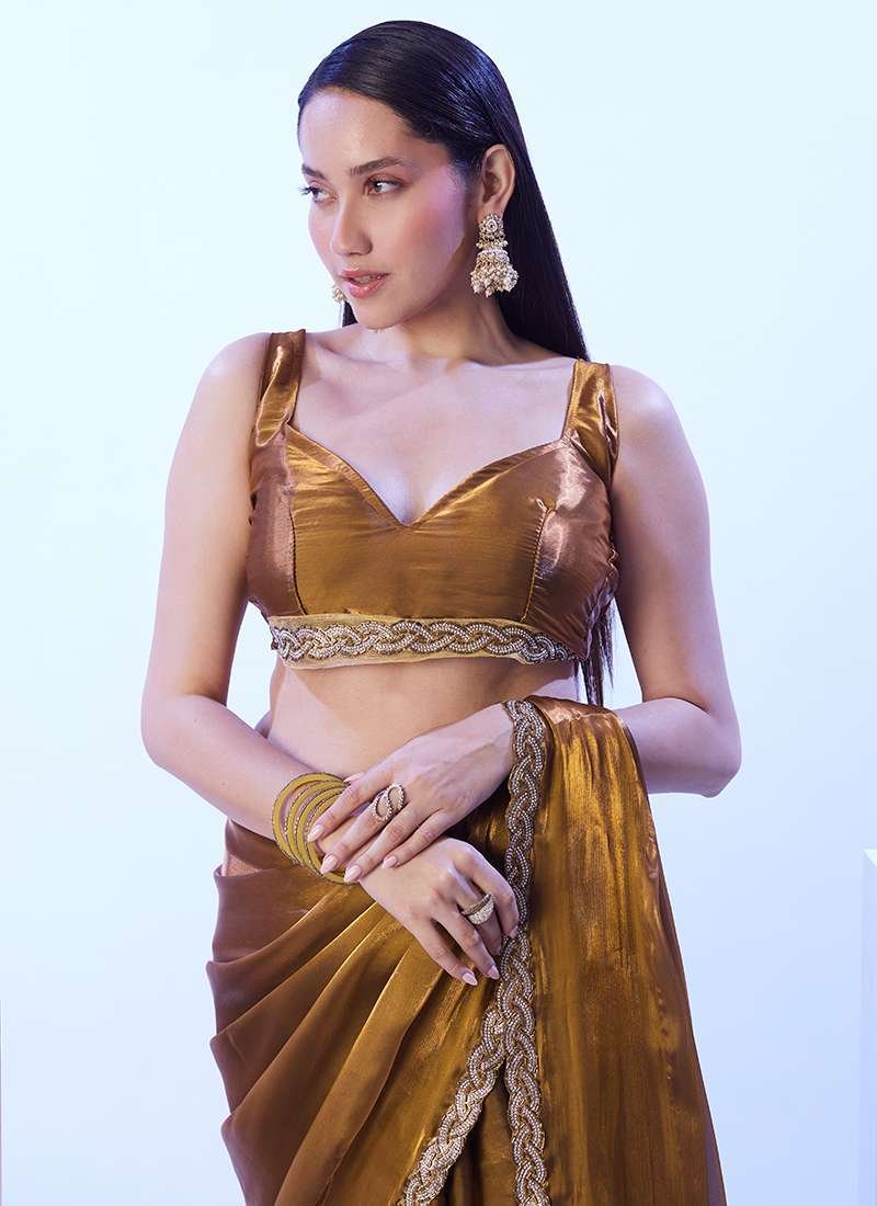 Unveil the epitome of elegance with the Jimmy Choo Golden Ceremonial Wear Lace Work Saree. This exquisite saree, crafted from the opulent Jimmy Choo fabric, exudes a breathtaking golden hue that will captivate all eyes. Intricate lace work adorns the saree, creating a mesmerizing tapestry that showcases the unparalleled artistry of Indian craftsmanship. Perfect for grand ceremonial events, this saree will transform you into a vision of ethereal beauty. Note that accessories in the image are for presentation only, and the saree length may vary slightly. Dry cleaning is recommended for the first wash to preserve its pristine condition.