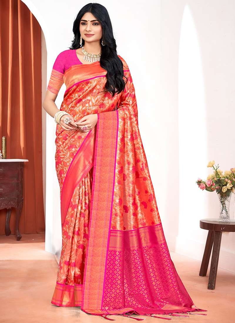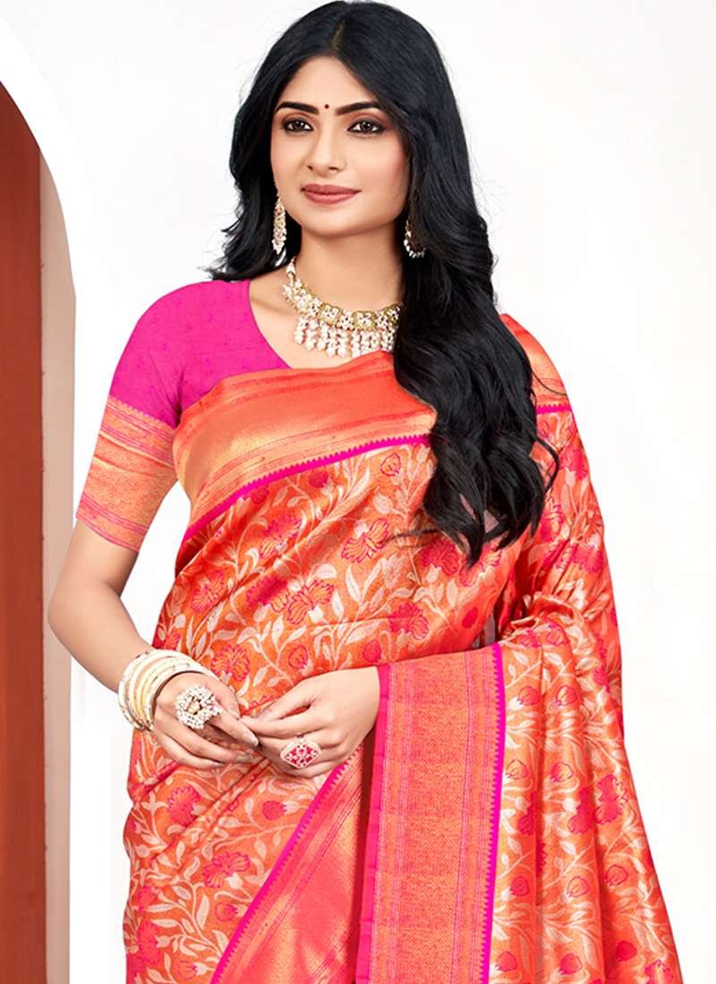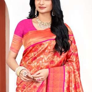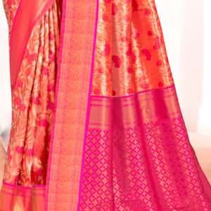Experience the elegance and allure of our exquisite Kanjivaram Silk Pink Festival Wear Weaving Saree. This vibrant masterpiece is crafted from pure Kanjivaram silk, renowned for its luxurious texture and intricate craftsmanship. The vibrant pink hue adds a touch of femininity and charm to your festive ensemble. The saree is adorned with an exquisite weaving design, featuring intricate patterns and motifs that exude opulence and grandeur. Perfect for special occasions and festivals, this saree will make a statement wherever you go. Its lightweight and breathable fabric ensures comfort all day long. Note that the first wash should be dry cleaned, and accessories shown in the image are for presentation purposes only. Embrace the beauty and tradition of Indian handloom with our Kanjivaram Silk Pink Festival Wear Weaving Saree.