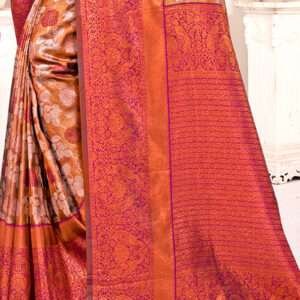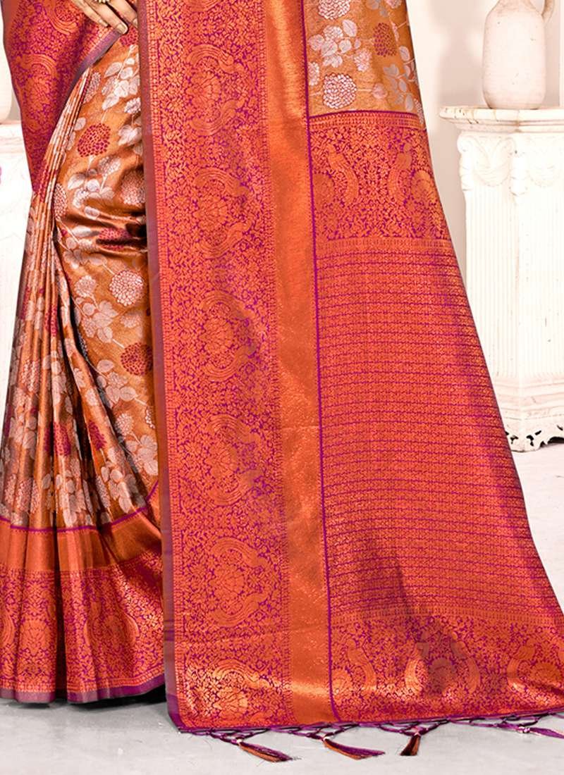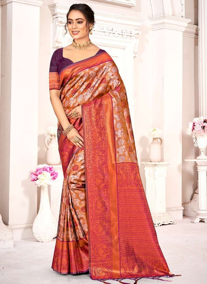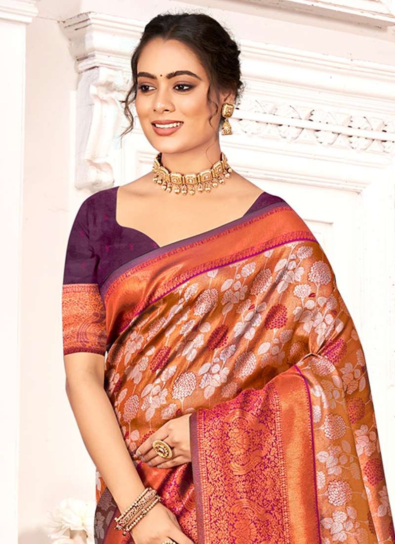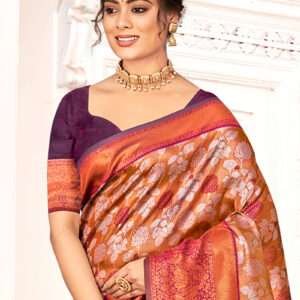 Immerse yourself in the vibrant tapestry of tradition and opulence with our exquisite Kanjivaram Silk Purple Festival Wear Weaving Saree. Crafted from the finest Kanjivaram silk, this masterpiece features intricate weaving that dances across the fabric like a symphony of colors. Adorned in the captivating hue of purple, it emanates regality and elegance. The seamless blend of fine silk threads creates a lustrous drape that flows with grace and allure. This saree is the embodiment of Indian artistry, perfect for gracing any festive occasion. Whether you’re the radiant bride or a resplendent guest, this Kanjivaram masterpiece will elevate your style to an unforgettable level of sophistication. Note: First wash dry clean.