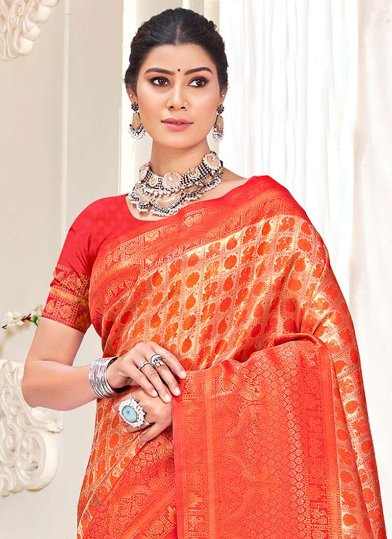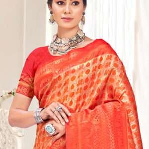 Immerse yourself in the vibrant hues and intricate artistry of our Kanjivaram Silk Red Festival Wear Weaving Saree. Woven from luxurious kanjivaram silk, this exquisite garment captivates with its stunning red color. The saree features intricate weaving patterns that adorn its length, adding an elegant touch to its timeless design. Perfect for grand festivals and special occasions, this saree exudes an ethereal charm that will make a lasting impression. The delicate craftsmanship and exceptional quality of the fabric ensure a comfortable and graceful drape, making it a true masterpiece for your wardrobe. Note that the length may vary slightly, and accessories shown in the image are for presentation purposes only.