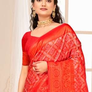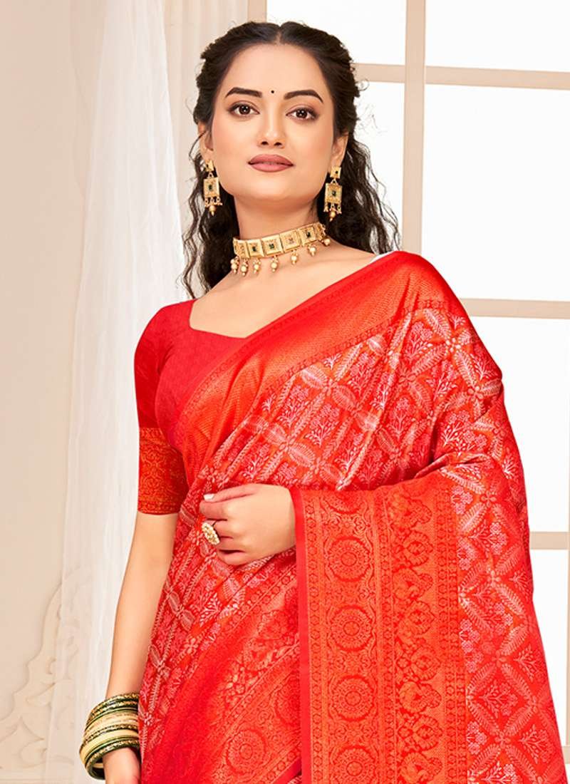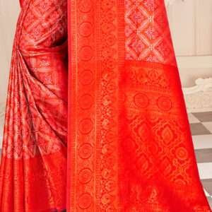 Indulge in the opulence of our exquisite Kanjivaram Silk Red Wedding Wear Weaving Saree. Crafted with the finest kanjivaram silk, this stunning saree is adorned with intricate weaving that adds a touch of grandeur to your special day. The vibrant red hue exudes an aura of joy and celebration, making it the perfect choice for a traditional wedding ceremony. The saree’s shimmering fabric and intricate craftsmanship create a masterpiece that is both elegant and captivating. Note that the accessories shown in the image are for presentation purposes only, and the actual length may vary slightly.