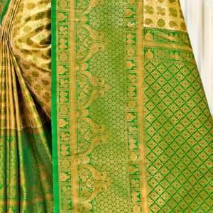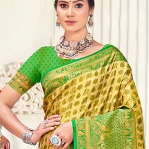 Immerse yourself in the grandeur of our Kanjivaram Silk Yellow Festival Wear Weaving Saree. Crafted from the finest Kanjivaram silk, this exquisite attire features intricate weaving that captivates the senses. Its vibrant yellow hue radiates elegance, making it an ideal choice for festive occasions. The saree’s unparalleled texture and exquisite craftsmanship create a masterpiece that will turn heads wherever you go. Note that the accessories showcased in the image are solely for display purposes, and the actual length of the saree may vary slightly.