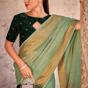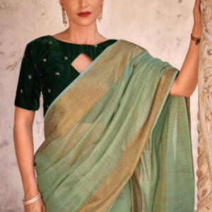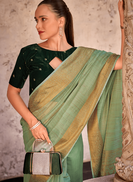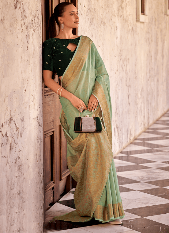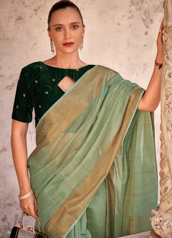 Immerse yourself in the ethereal beauty of our Linen Light Green Casual Wear Zari Work Saree. Crafted from the softest linen, this exquisite drape envelops you in comfort and style. Intricate zari embroidery adorns the saree, creating a captivating shimmer that dances upon your movements. The light green hue evokes a sense of tranquility and freshness, perfect for any casual occasion. Each saree is lovingly handwoven, ensuring a unique and timeless piece that will be cherished for years to come. First wash dry clean recommended. Please note that accessories shown in the image are for presentation purposes only.