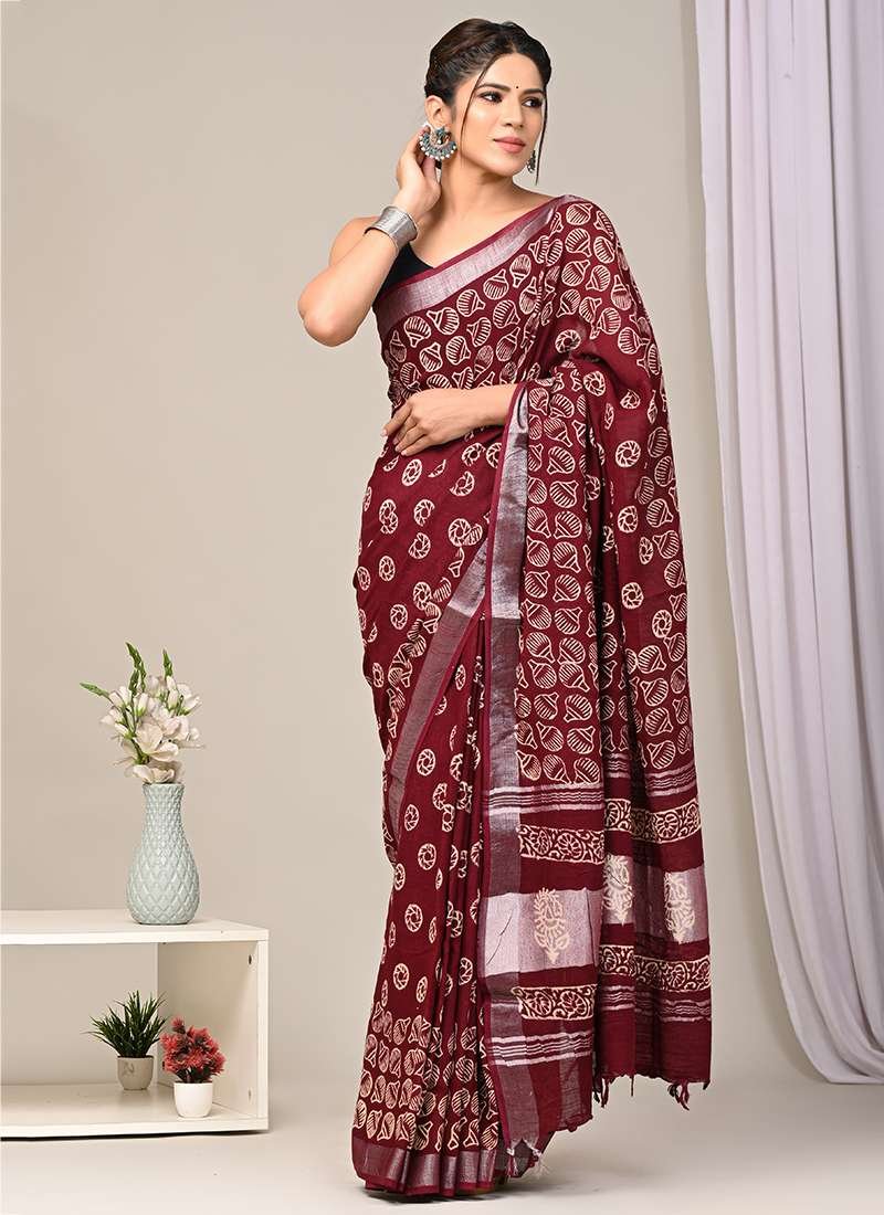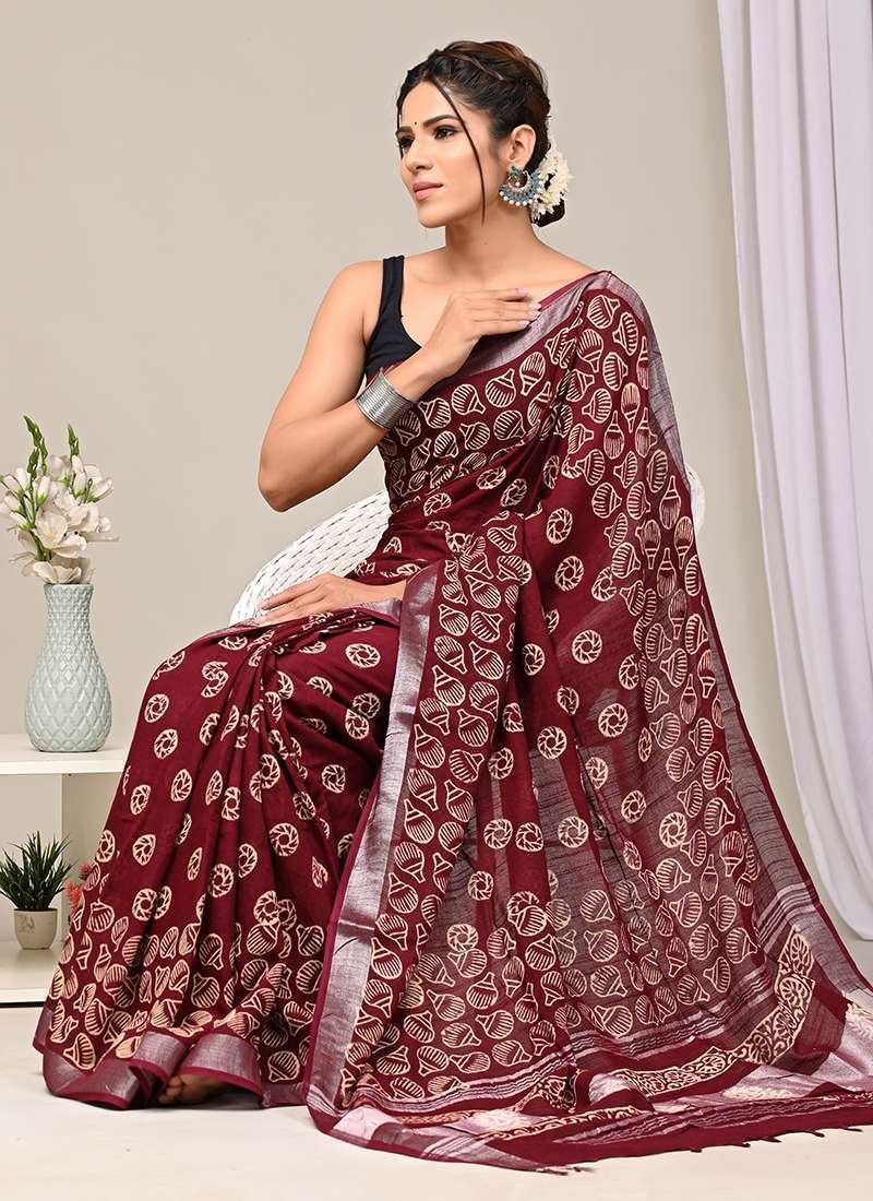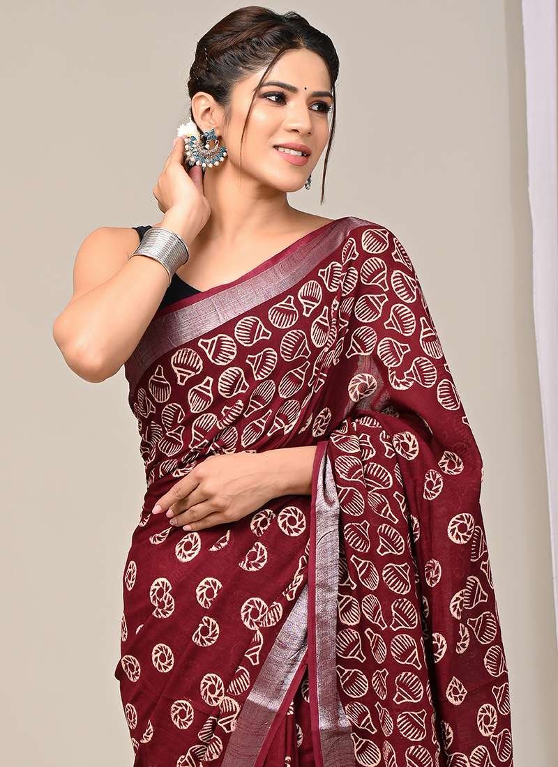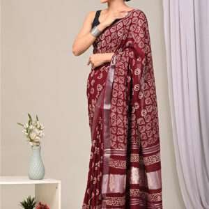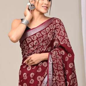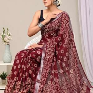 Introducing the exquisite Maroon Linen Cotton Casual Wear Bagru Printed Saree, an epitome of grace and style. Crafted from the finest linen cotton fabric, this saree exudes elegance with its rich maroon hue. The intricate Bagru print adorning it lends an air of traditional sophistication, making this attire perfect for casual wear. Its lightweight and breathable nature ensures comfort throughout the day, while the vibrant print adds a touch of panache to your wardrobe. Pair this saree with a blouse of your choice and accessories to complete the look. First wash dry clean is recommended to preserve its pristine condition. Available in a range of sizes to suit every woman, this saree is a must-have for those who appreciate a blend of comfort and style.