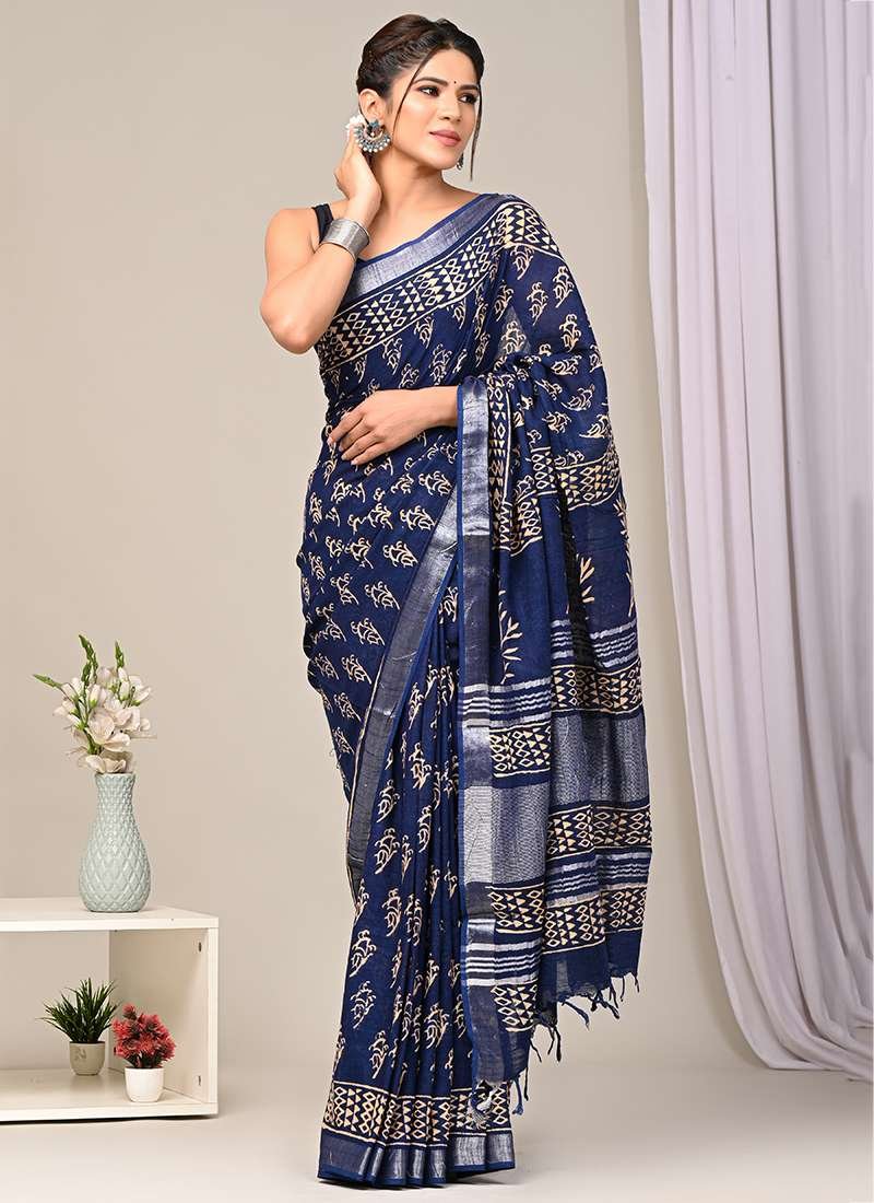 • linen cotton Sarees In navy blue