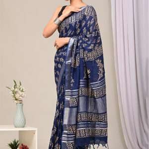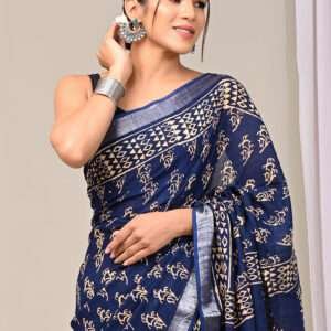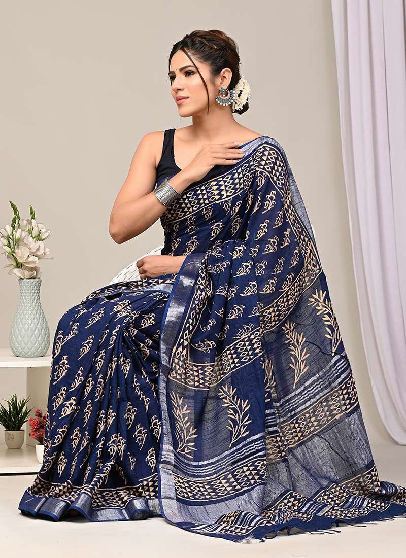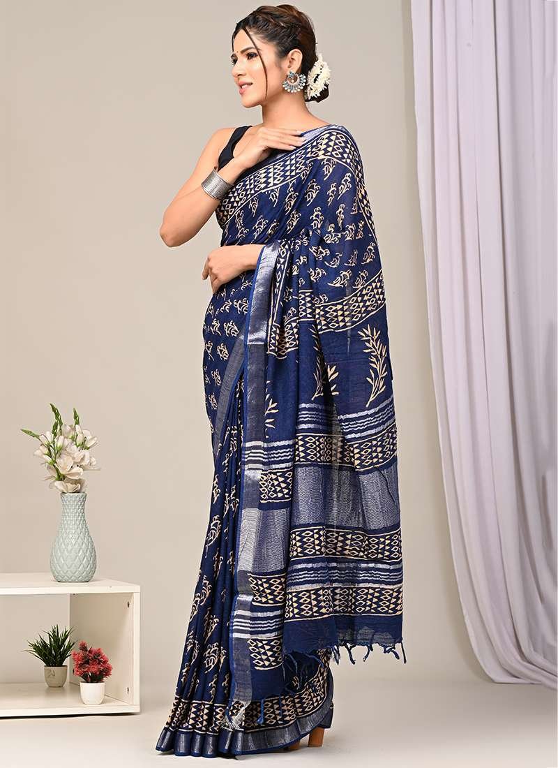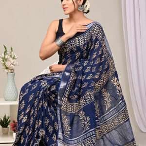 Malhari Navy Blue Linen Cotton Bagru Printed Saree
