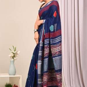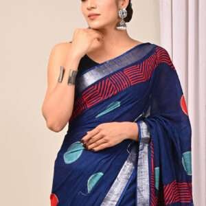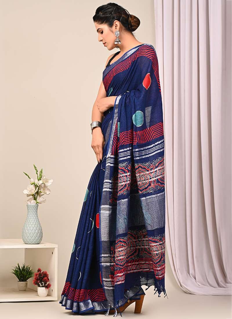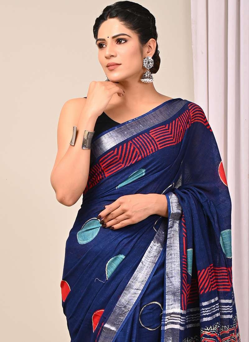 Indulge in the ethereal charm of our Navy Blue Linen Cotton Casual Wear Bagru Printed Saree. This exquisite drape exudes comfort and elegance with its luxurious linen cotton fabric. The intricate Bagru prints, meticulously hand-crafted, add a touch of traditional artistry to this modern silhouette. Perfect for casual gatherings or effortless everyday wear, this saree is a testament to the fusion of style and functionality. Its vibrant navy hue complements the intricate detailing, creating a captivating ensemble that embodies the essence of effortless chic. Note that the first wash should be dry cleaned to preserve the vibrancy and longevity of this exquisite piece.
