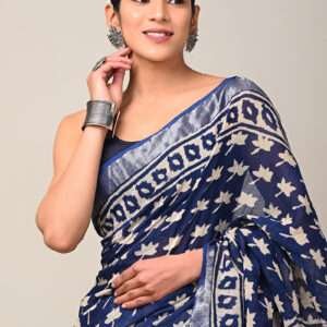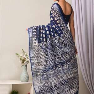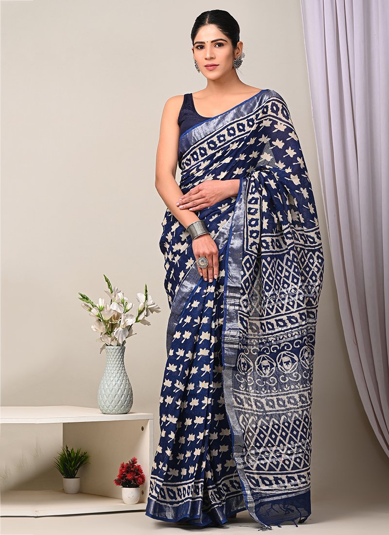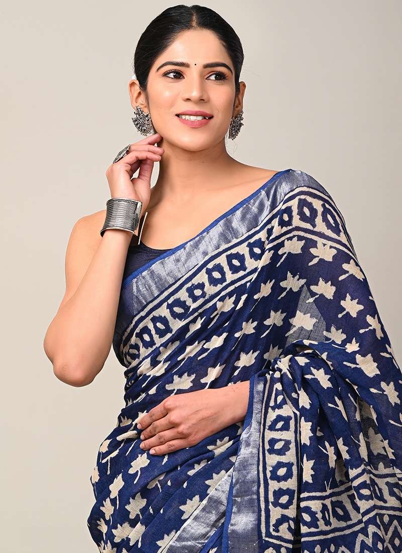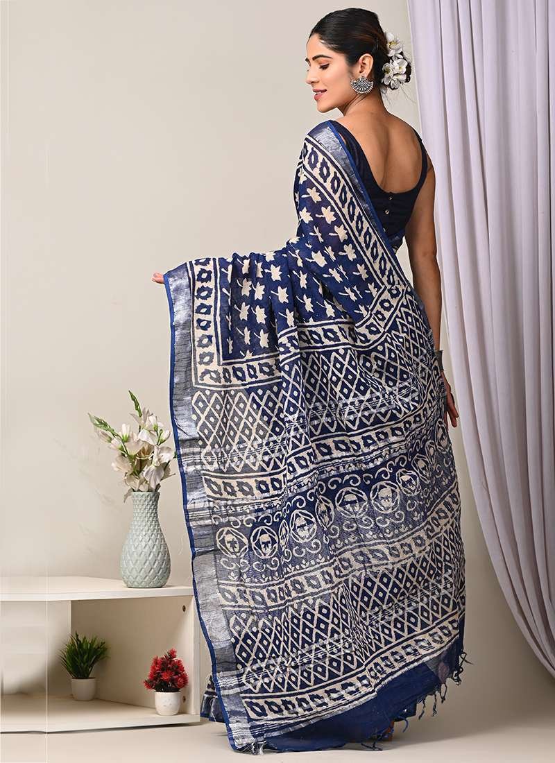 Malhari Navy Blue Linen Cotton Bagru Printed Saree