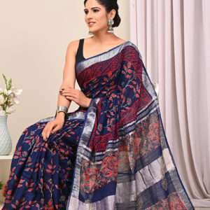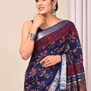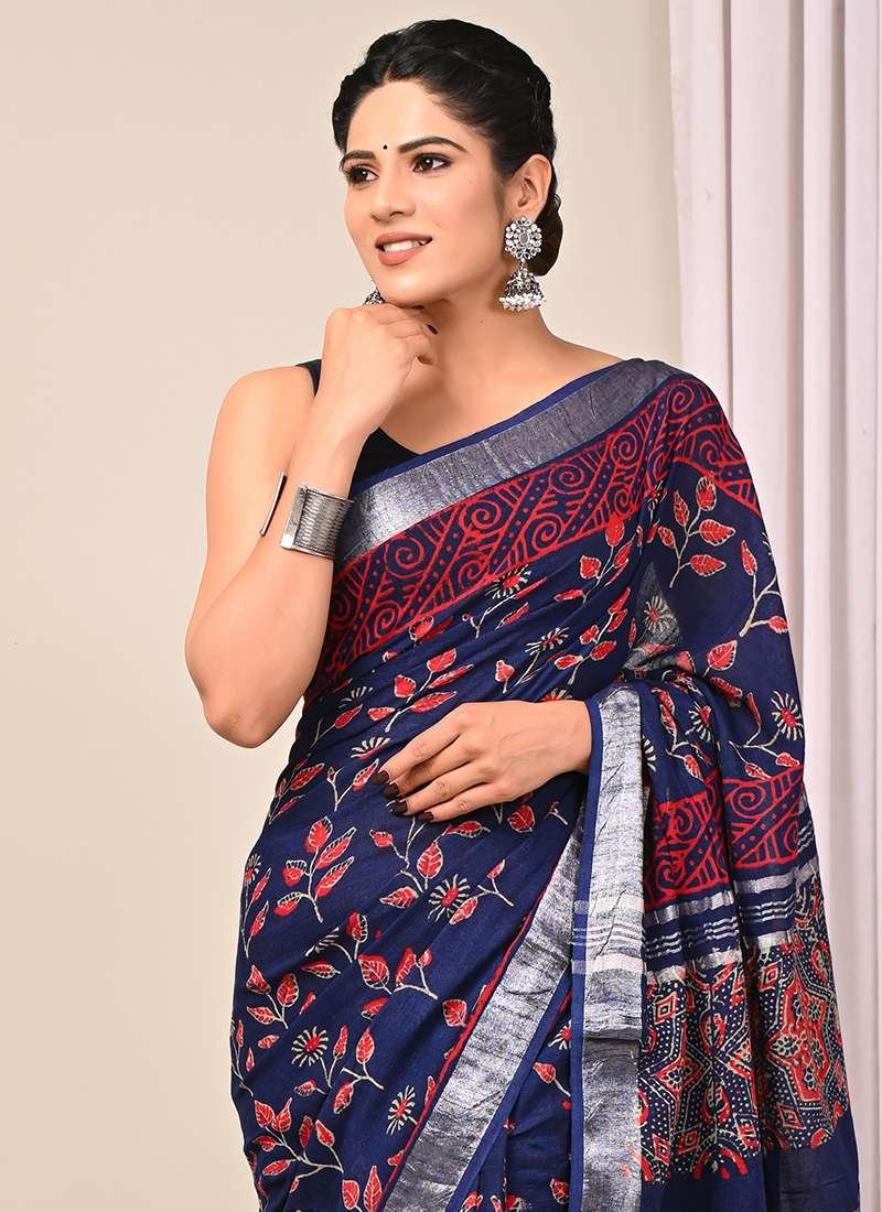 Indulge in elegance with our exquisite Navy Blue Linen Cotton Casual Wear Bagru Printed Saree. This captivating ensemble boasts a luxurious navy blue hue woven from the finest linen and cotton, offering both comfort and sophistication. The fabric is adorned with intricate Bagru prints, an ancient art form renowned for its botanical motifs and delicate craftsmanship. This saree is perfect for casual gatherings, exuding effortless style with its beautiful drape and breathable texture. Note that it requires dry cleaning for its first wash and may exhibit slight variations in color and length. The saree comes unaccompanied by the accessories shown in the image, and its length may differ slightly.
