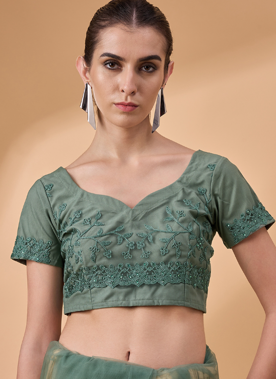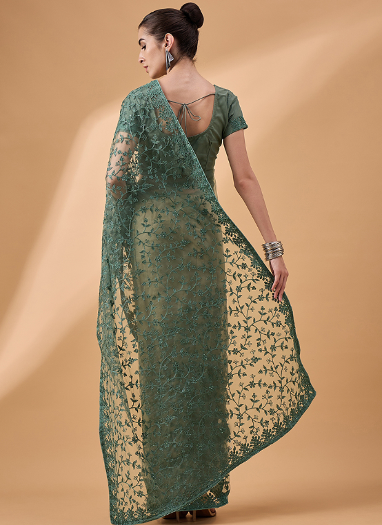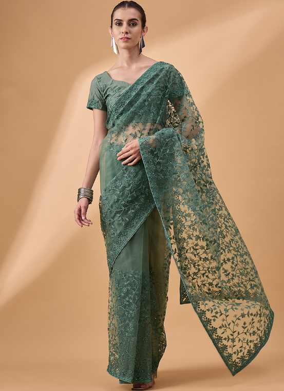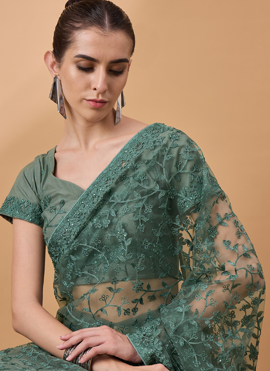 Indulge in the ethereal beauty of our Net Green Party Wear Floral Saree, a masterpiece that exudes elegance and allure. Crafted from delicate net fabric, this saree is adorned with exquisite floral motifs that dance across its vibrant green canvas. Its intricate embroidery adds a touch of opulence, making it the perfect attire for grand occasions. Pair it with statement jewelry and heels to elevate your ensemble to new heights. Dry cleaning is recommended for its first wash. With its captivating design and superior quality, our Net Green Party Wear Floral Saree is sure to turn heads and create lasting impressions.