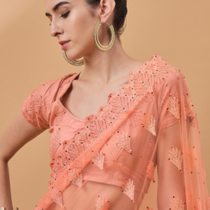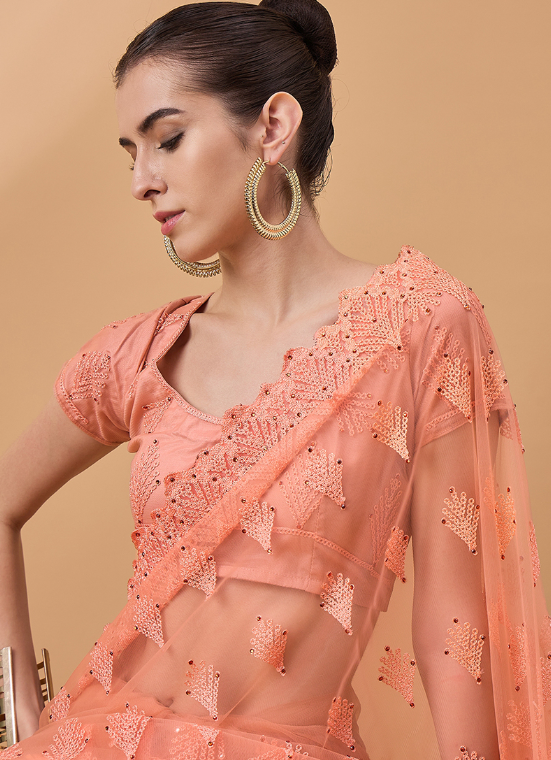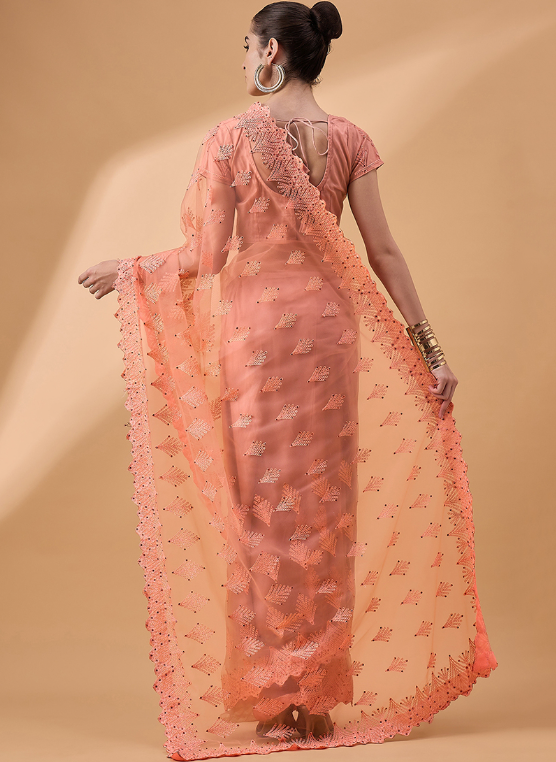 Indulge in the vibrant hues and feminine charm of this captivating Net Orange Party Wear Floral Saree. Crafted from the finest net fabric, this ethereal saree drapes gracefully over your silhouette, adorned with intricate floral motifs that dance across its surface. The vibrant orange hue exudes an irresistible aura, making it the perfect choice for special occasions. Pair it with the accompanying blouse to complete the ensemble, ensuring that you turn heads wherever you go. Note that the accessories showcased in the imagery serve as a visual representation only, and the actual saree’s length may vary slightly. Experience the timeless elegance and allure of this floral delight, perfect for any party wear celebration.