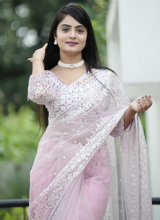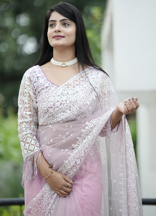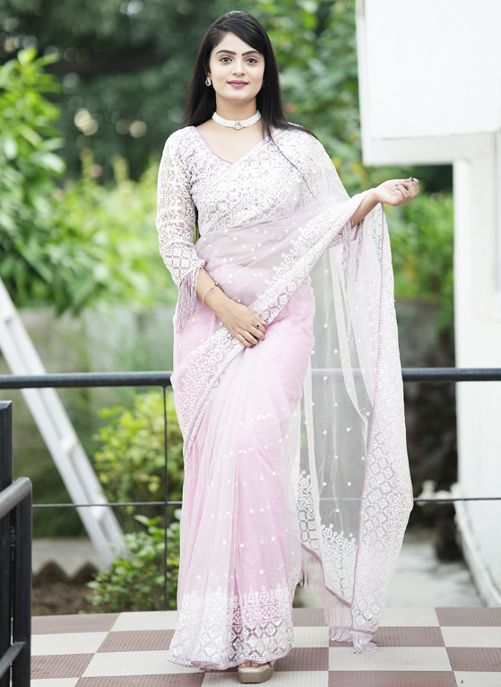 Indulge in the exquisite charm of our Net Pink Party Wear Sequins Work Saree, a masterpiece crafted to turn heads and elevate any special occasion. This captivating saree boasts a luxurious net fabric in a vibrant pink hue that exudes grandeur. Adorned with intricate sequins work, it dances like a million stars under the lights, creating a shimmering spectacle that will leave you breathless. From its flowy drape to its stunning embroidery, every detail of this saree is designed to enhance your presence and make you the center of attention at any party or gathering.