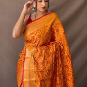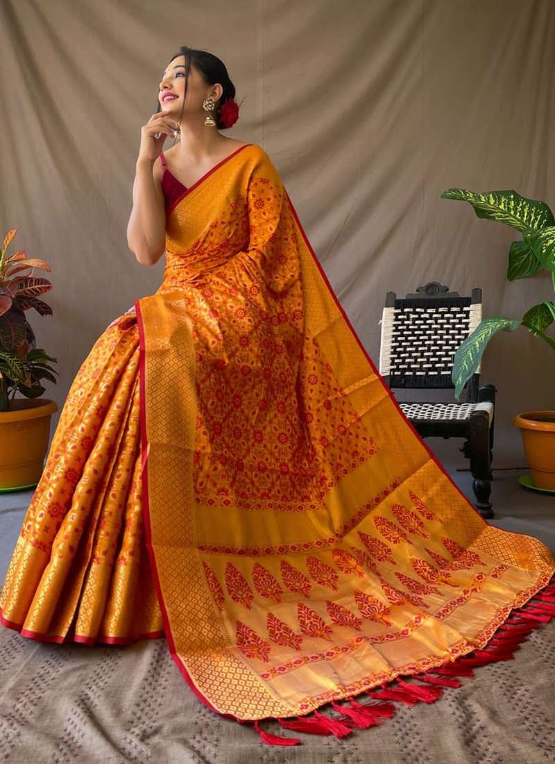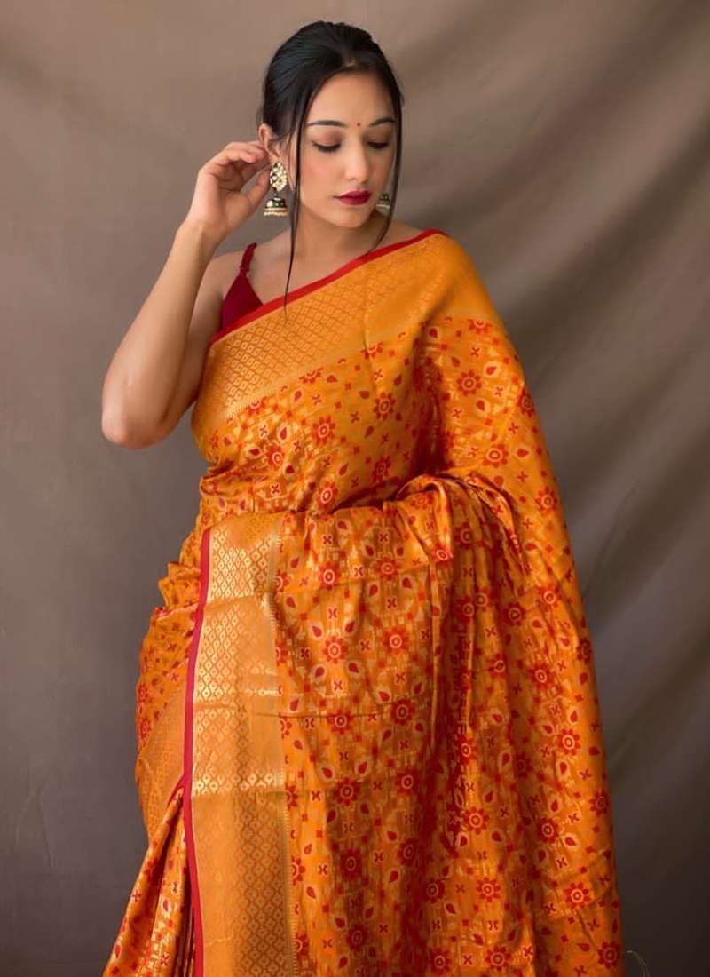 Indulge in the ethereal beauty of our Orange Patola Silk Festival Wear Weaving Saree, a masterpiece woven with intricate designs and vibrant hues. Crafted from the finest patola silk, this saree drapes elegantly, showcasing the exquisite weaving that adorns it. Its vibrant orange hue adds a touch of warmth and festivity to any occasion. The saree is adorned with intricate weaving patterns that create a mesmerizing display of artistry. Pair it with statement jewelry and a sleek clutch to complete your stunning ensemble. Dry cleaning is recommended for the first wash to preserve its delicate fabric. Embrace the grandeur of Indian tradition and make this exquisite patola silk saree a cherished part of your festive wardrobe.