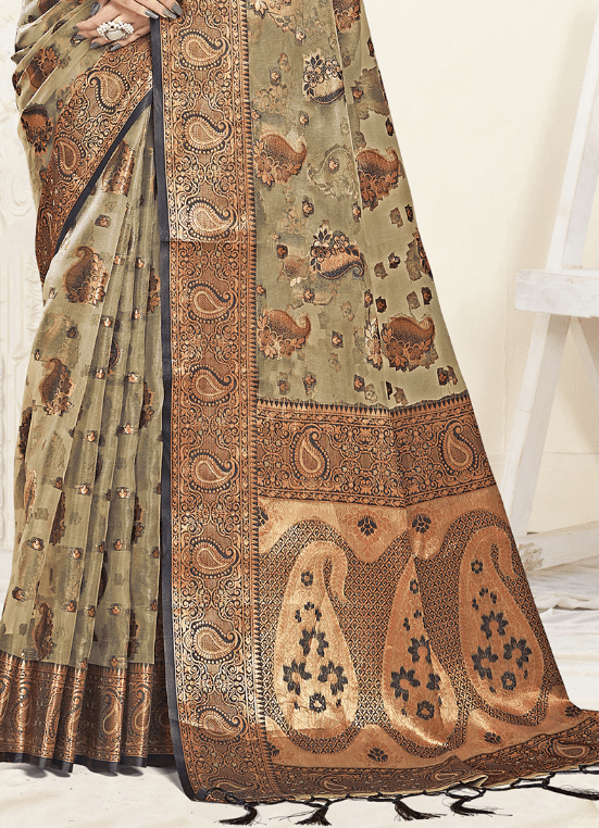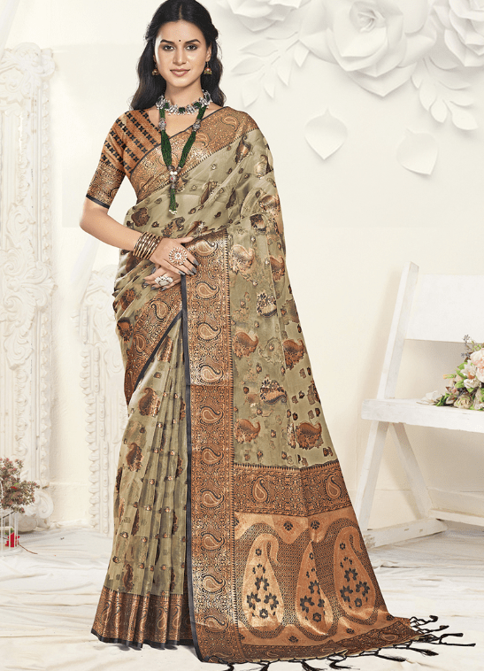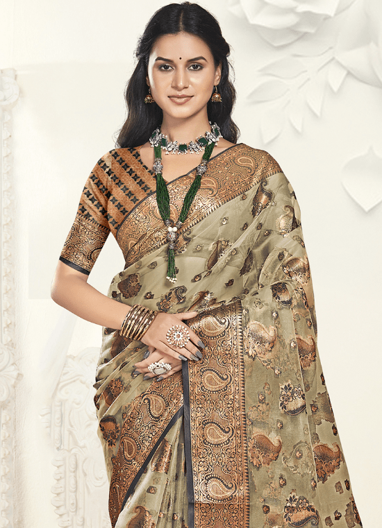 Immerse yourself in the ethereal elegance of our Organza Grey Traditional Wear Weaving Saree. Crafted from shimmering organza fabric, this masterpiece drapes gracefully over your form, exuding timeless sophistication. Its intricate weaving patterns dance across the fabric in a symphony of threads, creating an exquisite visual tapestry. The grey hue adds a touch of allure and versatility, making it perfect for any traditional occasion. Whether you’re attending a wedding, a religious ceremony, or a festive gathering, this saree will effortlessly elevate your presence and make you the center of attention.
