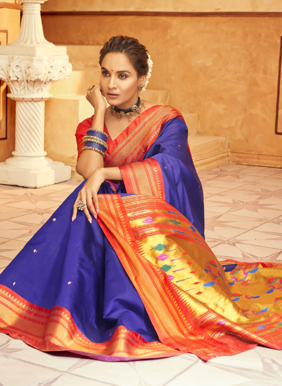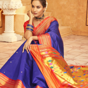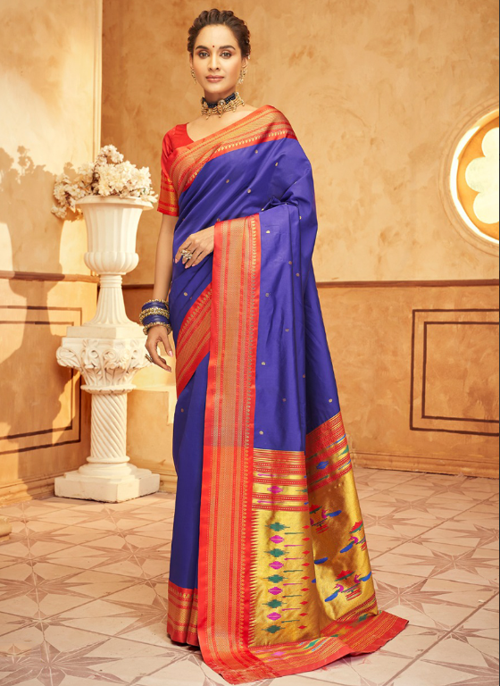 Immerse yourself in elegance with our Paithani Silk Blue Festival Wear Weaving Saree. Crafted from the finest paithani silk, this exquisite creation is adorned with intricate weaving patterns that shimmer under the light. Perfect for any festive occasion, this saree exudes a majestic charm. The vibrant blue hue adds a touch of regal sophistication, while the weaving work elevates it to a masterpiece. Each saree is a testament to the artistry of skilled weavers, promising a touch of tradition and luxury to your wardrobe. First wash dry clean only.
