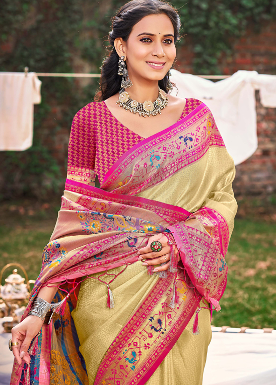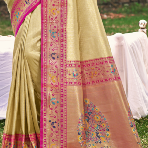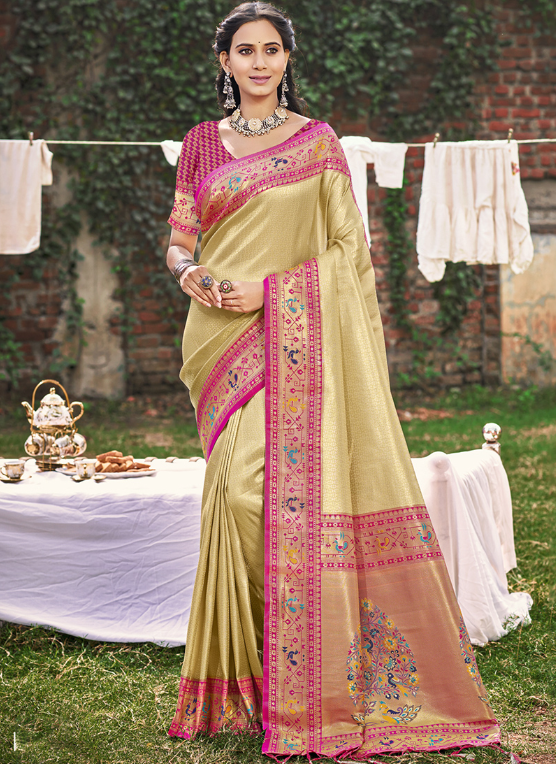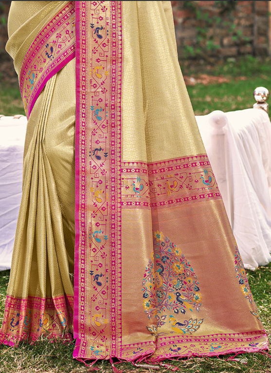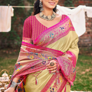 Indulge in the exquisite charm of our Paithani Silk Cream Party Wear Weaving Saree. This breathtaking attire boasts a luxurious paithani silk fabric, adorned with intricate weaving that adds a touch of opulence to any occasion. Its cream hue exudes elegance and sophistication, making it a perfect choice for formal events. The vibrant embroidery adds a captivating dimension, drawing attention to its exquisite craftsmanship. Our saree is meticulously designed with a flattering silhouette that accentuates your curves, ensuring a graceful and alluring look. Its rich texture and shimmering embellishments will make you the center of admiration at any gathering. Elevate your wardrobe with this captivating piece, handcrafted with love and attention to detail.