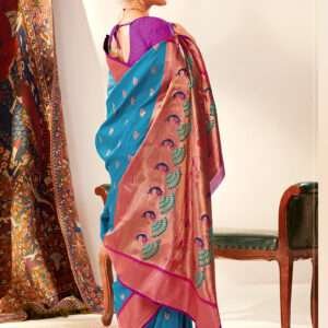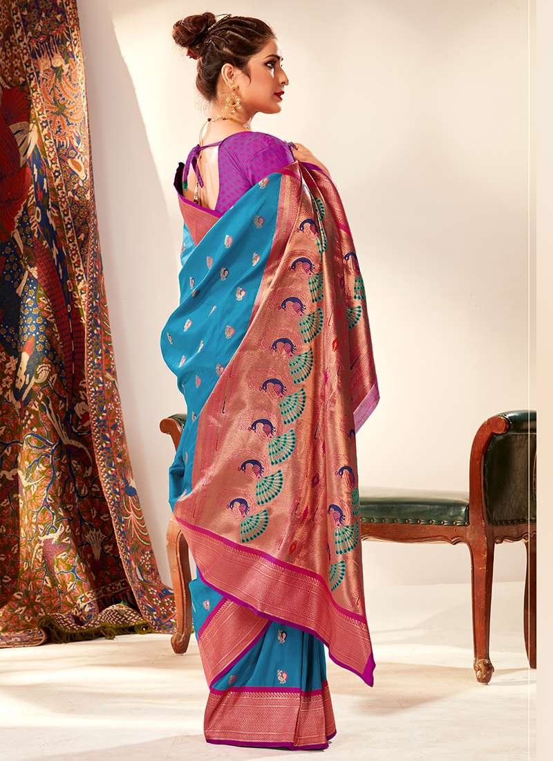 Indulge in the exquisite beauty of our Paithani Silk Firozi Festival Wear Weaving Saree, a masterpiece woven with the finest Paithani silk. Its vibrant firozi hue adds a touch of regal elegance, while the intricate weaving showcases the exceptional craftsmanship of traditional Indian artisans. Perfect for festive occasions, this saree exudes an aura of grandeur and sophistication. The lustrous fabric drapes effortlessly, enhancing your silhouette with a graceful flow. Note that the first wash should be dry cleaned, and the saree may vary in length by up to 2 inches. Embrace the allure of this exquisite saree and make a statement wherever you go.