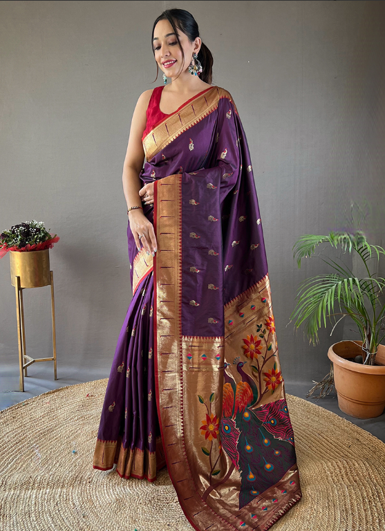 Indulge in the exquisite beauty of our Paithani Silk Purple Traditional Wear Weaving Saree, a masterpiece that embodies the rich cultural heritage of India. Crafted from shimmering paithani silk, this elegant drape boasts intricate weaving that adds a touch of enchantment to your ensemble. Its vibrant purple hue commands attention, while the traditional wear design evokes a timeless allure. Perfect for special occasions that demand sophistication, this saree is a testament to the artistry and craftsmanship of Indian textiles. Embrace the epitome of grace and elegance with our Paithani Silk Purple Traditional Wear Weaving Saree.
