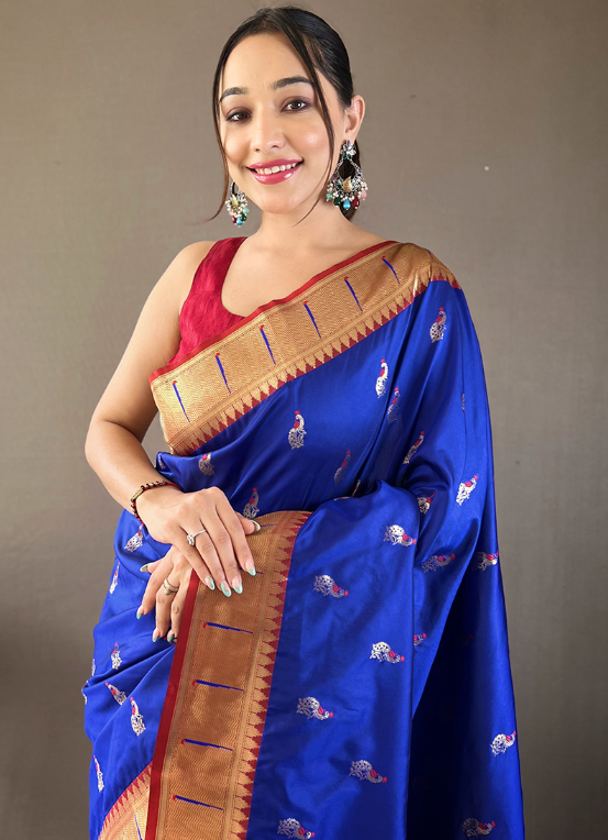 Indulge in the regal elegance of our Paithani Silk Violet Traditional Wear Weaving Saree. Woven from the finest paithani silk, this exquisite drape features intricate weaving that embodies the rich heritage of Indian craftsmanship. Its vibrant violet hue emanates an aura of femininity and grace, making it the perfect choice for special occasions and traditional events. The fabric’s soft texture and delicate sheen will gently caress your skin, providing unparalleled comfort and allure. Note that the first wash should be dry cleaned, and accessories shown in the image are for presentation purposes only. Embrace the timeless beauty and cultural significance of our Paithani Silk Saree, a masterpiece crafted with meticulous attention to detail and designed to make you feel truly exceptional.