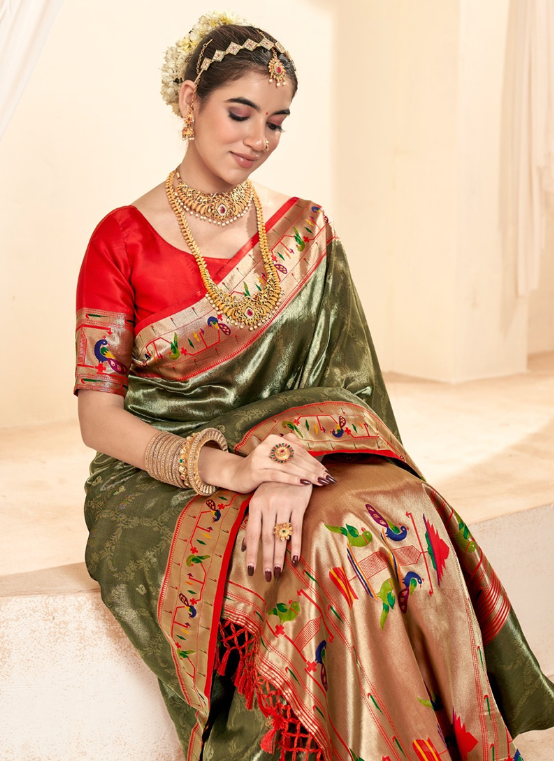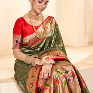 Immerse yourself in the exquisite opulence of our Paithani Tissue Silk Green Festival Wear Zari Work Saree, a masterpiece crafted from the finest paithani tissue silk and adorned with intricate zari work. This enchanting saree boasts a mesmerizing shade of green, perfect for gracing any festive occasion. Its delicate zari work seamlessly enhances the fabric, creating an ethereal effect that will turn heads. While its allure is undeniable, it is important to note that the first wash should be dry cleaned. The length of the saree may vary slightly, and the accessories shown in the image are for presentation purposes only.