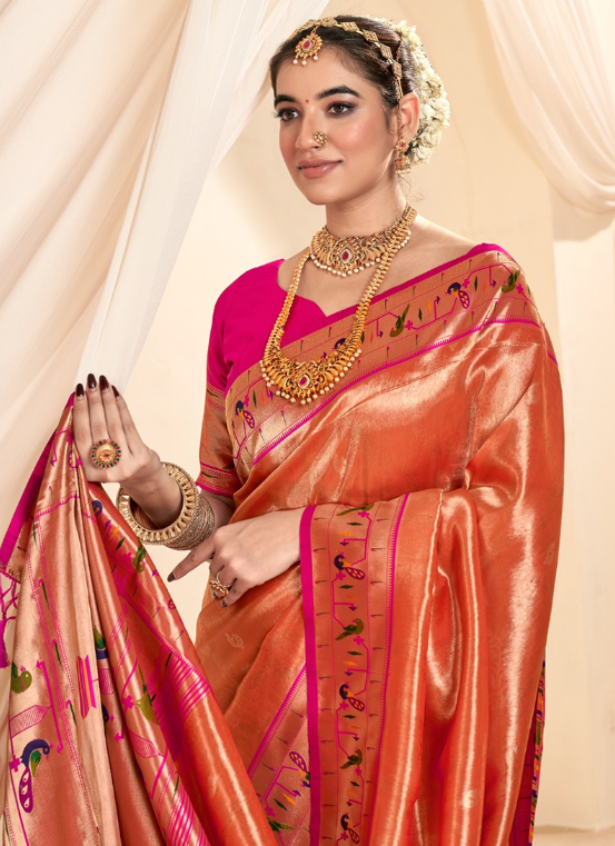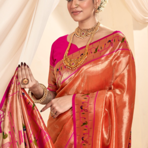 Elevate your festive wardrobe with this exquisite Paithani Tissue Silk Peach Festival Wear Zari Work Saree. Crafted from luxurious Paithani Tissue Silk in a charming peach hue, this saree exudes elegance and sophistication. The intricate zari work adorning the pallu and border adds a touch of traditional charm to this contemporary piece. Ideal for weddings and other grand occasions, this saree will make you the cynosure of all eyes. Note that accessories shown in the image are solely for presentation purposes, and the length may vary slightly due to manual processing.