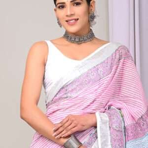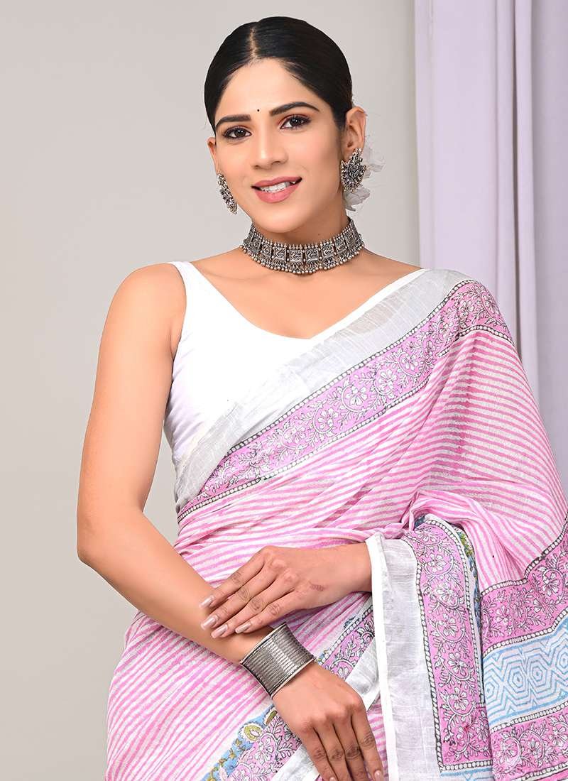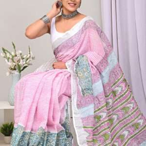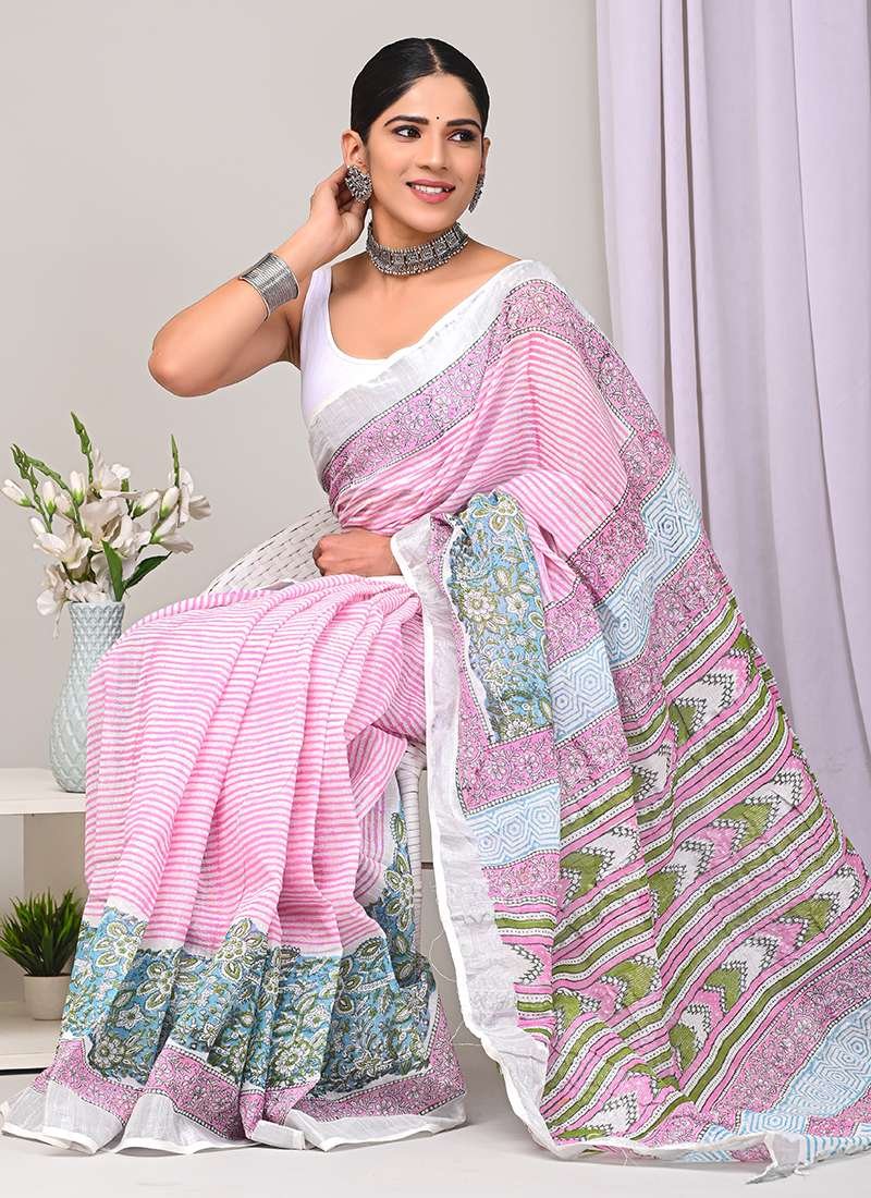 Indulge in the vibrant allure of our exquisite Pink Linen Cotton Casual Wear Bagru Printed Saree. This ethereal piece crafted from the finest linen cotton is a symphony of soft texture and captivating prints. Its intricate Bagru print, an ancient art form from Rajasthan, adds a touch of ethnic elegance to the ensemble. The saree’s delicate pink hue radiates a gentle femininity, making it perfect for casual gatherings and everyday wear. Experience the effortless drape and breathable comfort of this timeless garment, designed to elevate your style with grace and sophistication. Note: Dry cleaning is recommended for the first wash, and slight variations in color and length are possible.