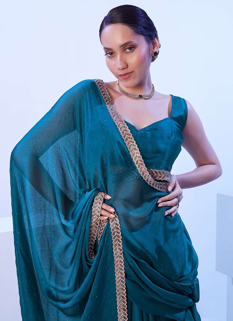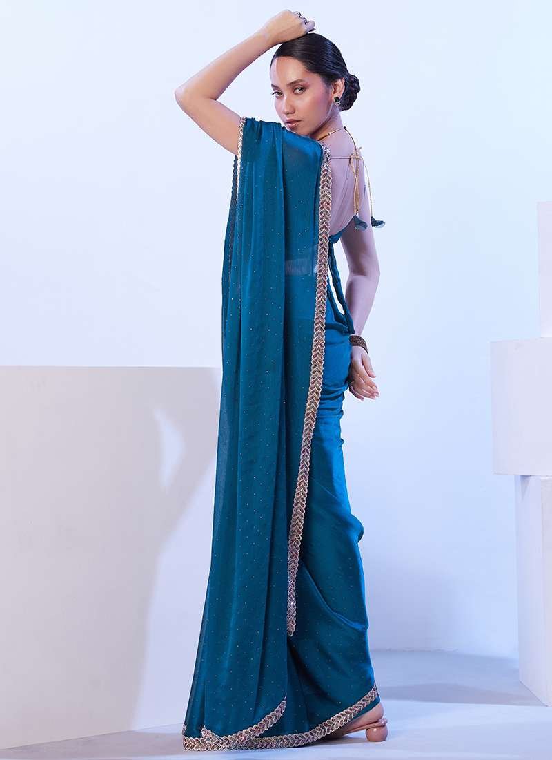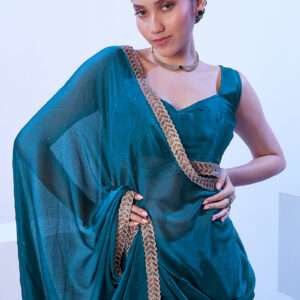 Indulge in the ethereal beauty of our Satin Chiffon Aqua Blue Ceremonial Wear Lace Work Saree. Crafted from shimmering satin chiffon, this alluring attire boasts an enchanting aqua blue hue that radiates elegance. Intricately adorned with delicate lace work, it adds a touch of exquisite charm to your ceremonial ensembles. Perfect for momentous occasions, this saree exudes sophistication and grace, making it a captivating choice for those seeking an unforgettable sartorial experience.