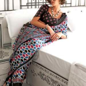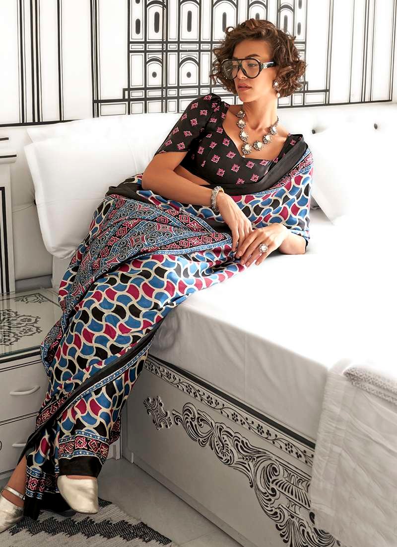 Indulge in this exquisite Satin Crape Black Casual Wear Ajarkh Digital Print Saree, a masterpiece of traditional artistry. Crafted from luxurious satin crepe, its rich black hue exudes timeless elegance. Adorned with an eye-catching Ajarkh digital print, this saree features intricate patterns that evoke the vibrant heritage of India. Perfect for casual gatherings, it offers a graceful silhouette that will make heads turn. The intricate print adds a touch of sophistication, making it a versatile ensemble that can transition effortlessly from day to night. With a length of approximately 6.3 meters, this saree comes with a complementary unstitched blouse piece, allowing you to customize your neckline and sleeves. Experience the charm of traditional craftsmanship while embracing modern style with this captivating Satin Crape Black Casual Wear Ajarkh Digital Print Saree.