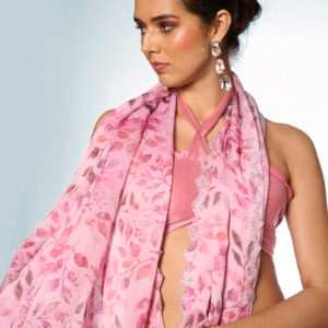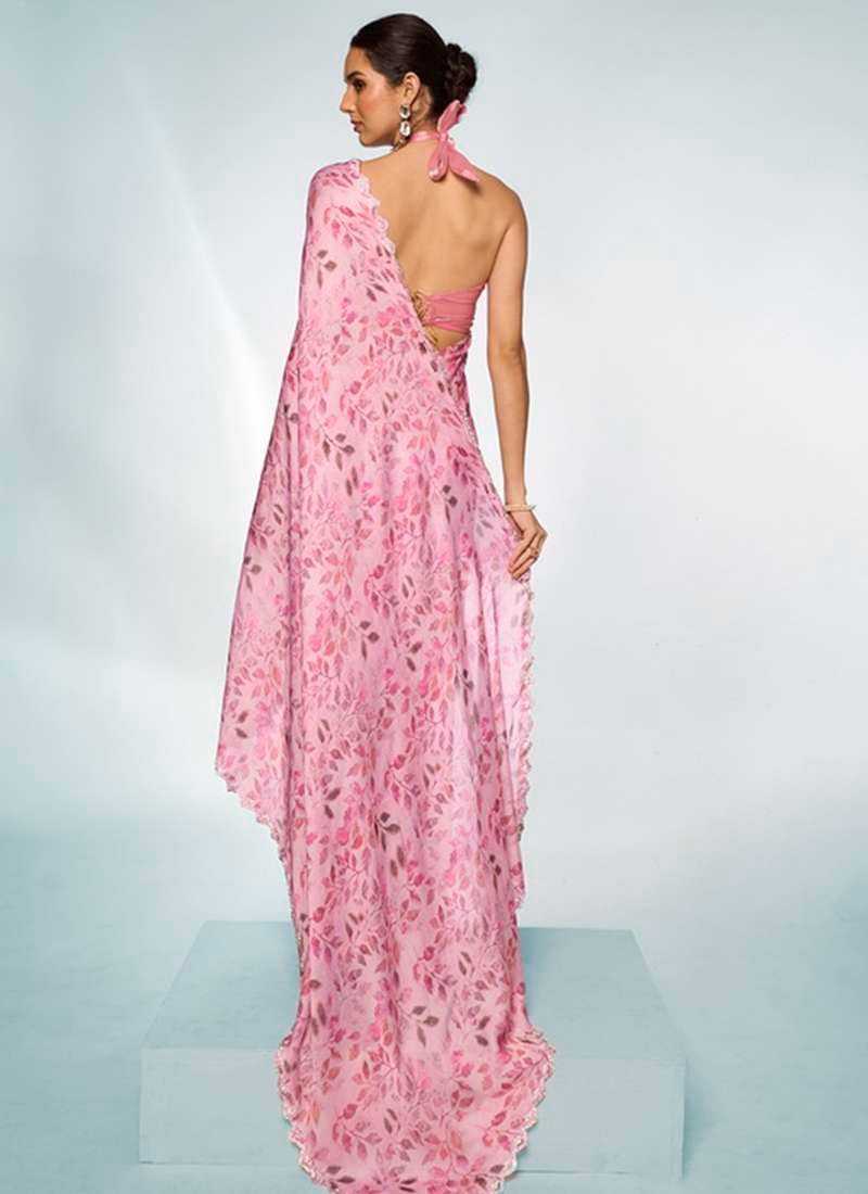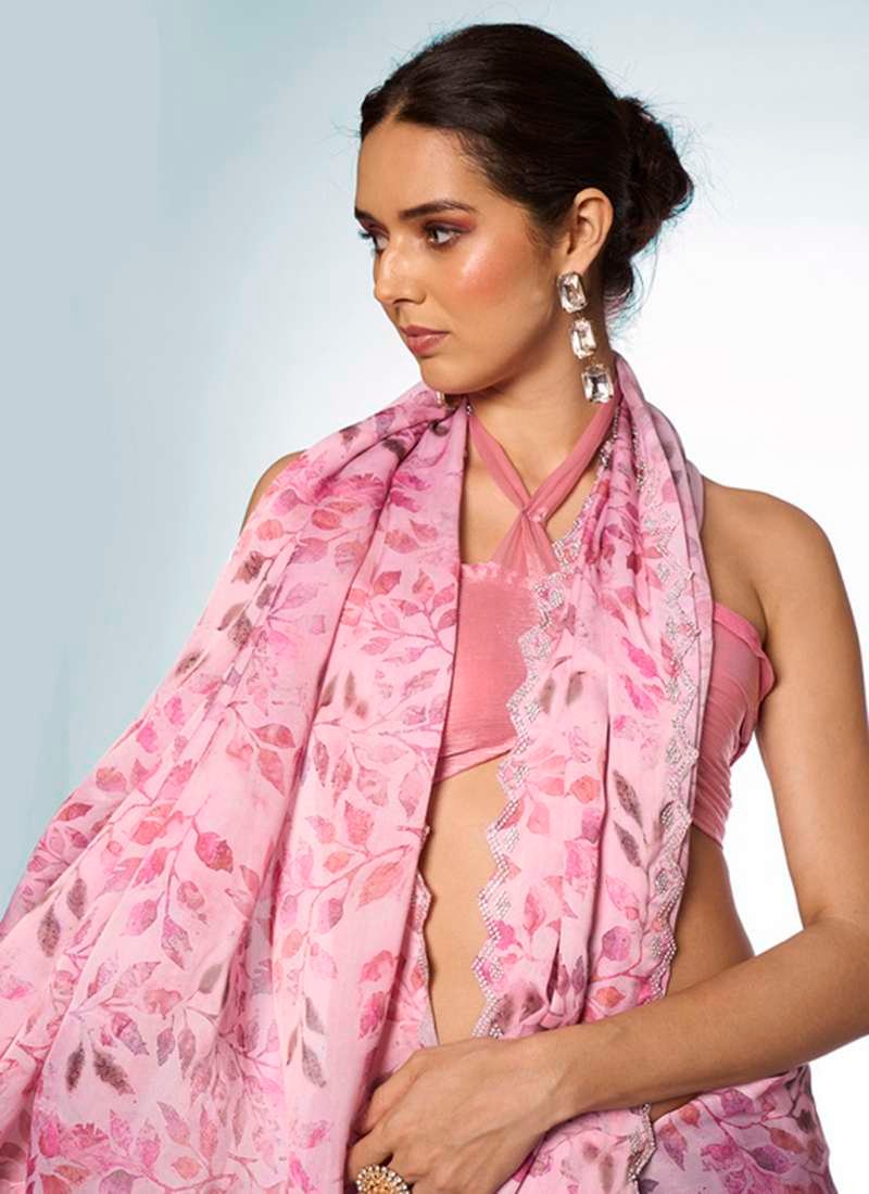 1. Elevate your ceremonial wardrobe with this exquisite Satin Georgette Pink Printed Saree, designed to make a statement at any special occasion. Crafted from luxurious satin georgette, this saree features intricate prints that enhance its elegance and charm.