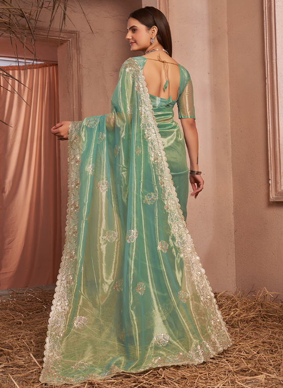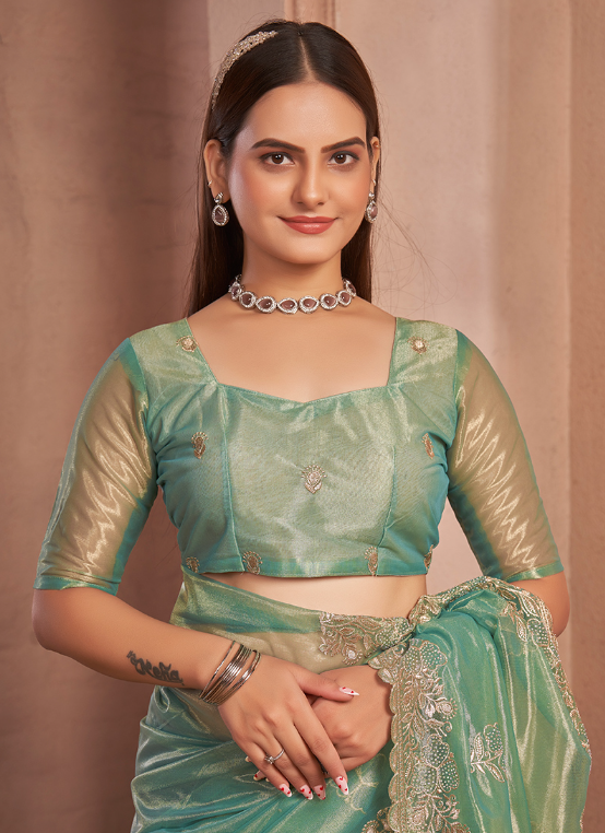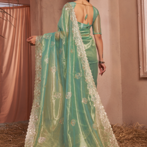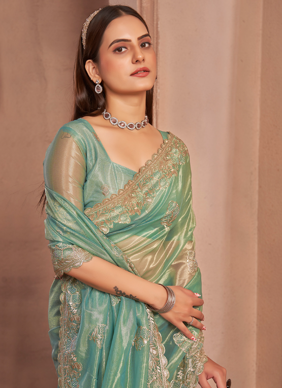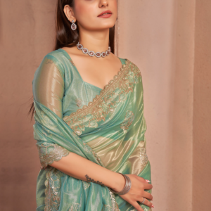 Indulge in the captivating allure of our Shimmer Silver Net Green Party Wear Swarovski Work Saree. Crafted from shimmering silver net fabric, this exquisite ensemble boasts an enchanting green hue, perfect for adding a touch of glamour to any festive occasion. The intricate Swarovski work adorning the saree adds an ethereal touch, making it a true masterpiece. This stunning attire is adorned with sparkling crystals, creating a mesmerizing display that will leave you captivating all who lay eyes upon you. Step into a world of elegance and sophistication with our Shimmer Silver Net Green Party Wear Swarovski Work Saree, designed to make you shine brighter than ever.