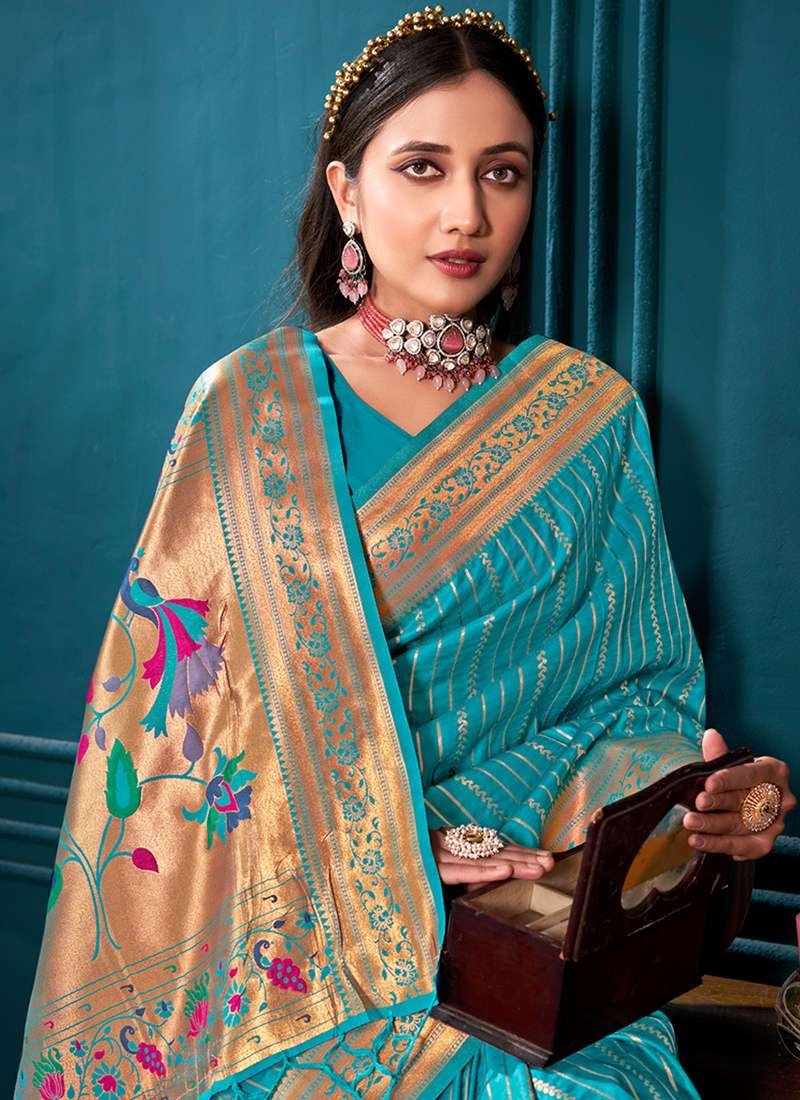 Indulge in the exquisite grandeur of our Silk Firozi Festival Wear Paithani Saree, steeped in traditional Indian artistry. This masterpiece is woven from the finest silk, imbued with an ethereal glow that radiates firozi elegance. The saree’s allure is enhanced by its elaborate paithani work, meticulously crafted to create intricate patterns that shimmer and dance with every move. Perfect for festive occasions, this timeless treasure exudes a regal charm that is sure to turn heads.