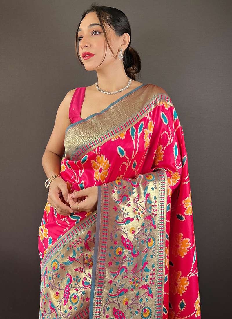 Immerse yourself in the vibrant allure of our Silk Hot Pink Festival Wear Patola Weaving Saree. Woven from the finest silk, this captivating garment boasts an intricate patola weaving design that dances across its surface in an ethereal symphony of hues. Its vibrant hot pink hue commands attention, making it an unforgettable statement piece for any festive occasion. Dry cleaning is recommended as the first wash to preserve its pristine beauty, and please note that accessories pictured are for display purposes only, and length may vary slightly.