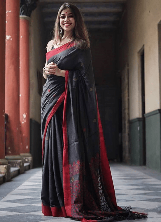 Indulge in the timeless elegance of our Soft Linen Black Daily Wear Weaving Saree. Crafted from the finest soft linen fabric, this exquisite drape offers unparalleled comfort and sophistication. The intricate weaving adds a touch of traditional charm, while the elegant black hue exudes a timeless allure. Perfect for everyday wear, this saree effortlessly transitions from work to social gatherings. Its versatile style makes it a wardrobe staple that will elevate any occasion. Experience the luxurious beauty of this soft linen saree and enhance your ethnic collection with a touch of understated elegance.